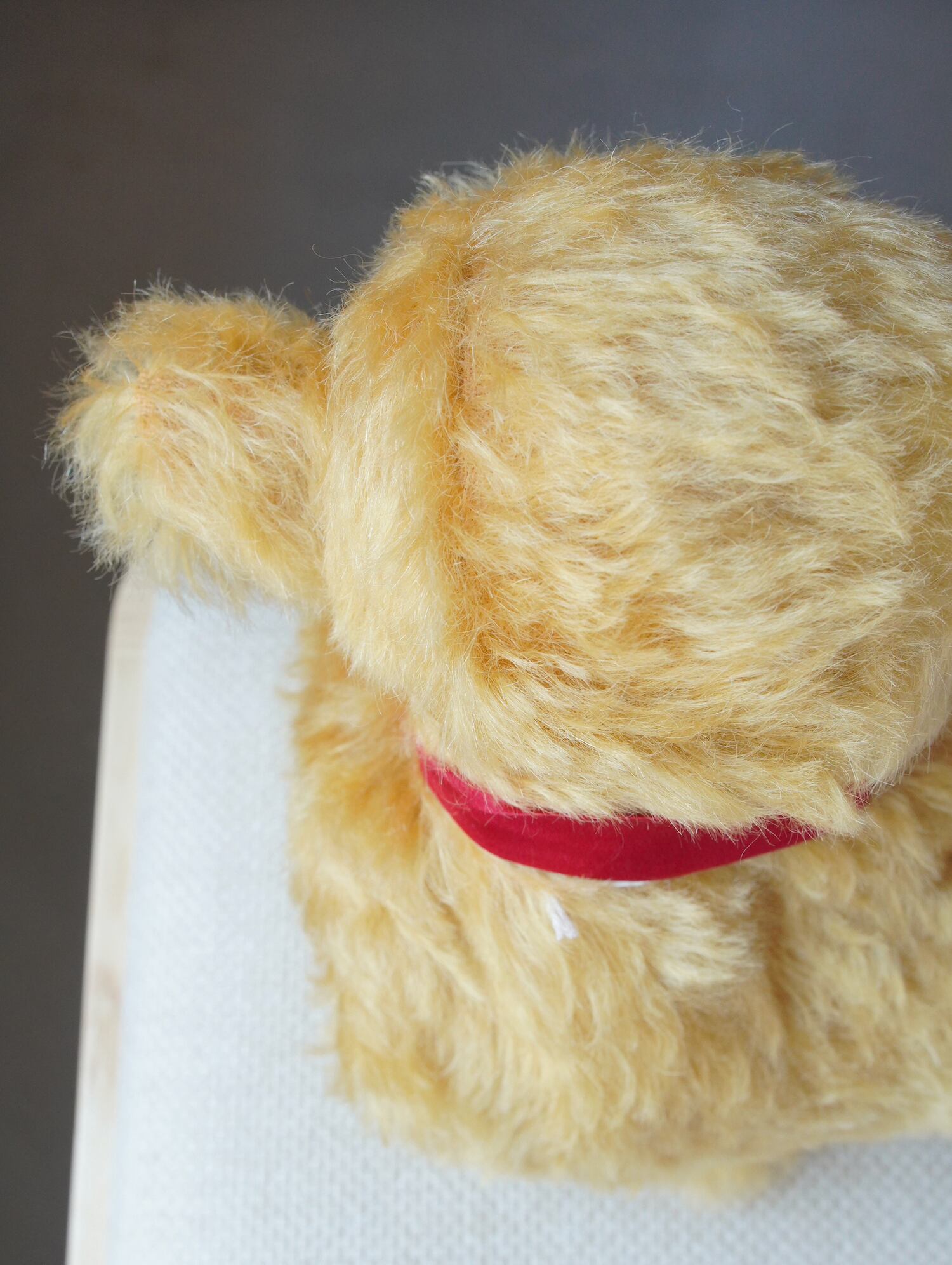 ゆるく大きな渦を巻いた、やや長めのモヘア(明るいゴールド)に赤色のシルクマフラーを合わせました。お口部分は短いタイプのモヘアを使用(ところどころでに黒い毛が混じります)。