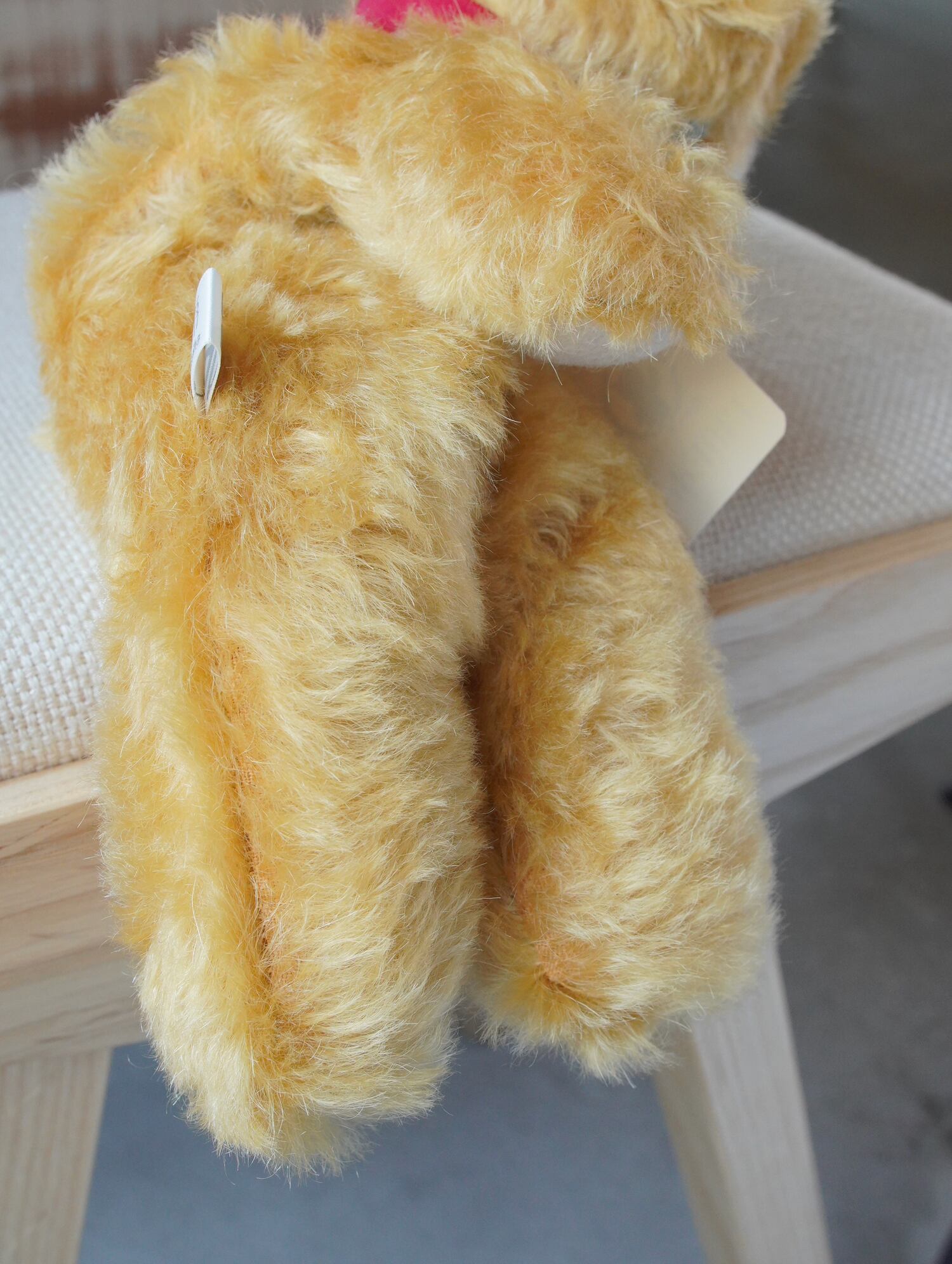 材料も最高級のものをセレクト。シュタイフシュルテ社のモヘア生地(アンゴラ山羊毛)、ドイツ製羊毛フェルト(青目・手・耳裏・尾裏)、マフラーにはシルク100%のサテン生地を使用しています。※目や鼻は「130」と同じプラスチック製ボタンを使用しています。