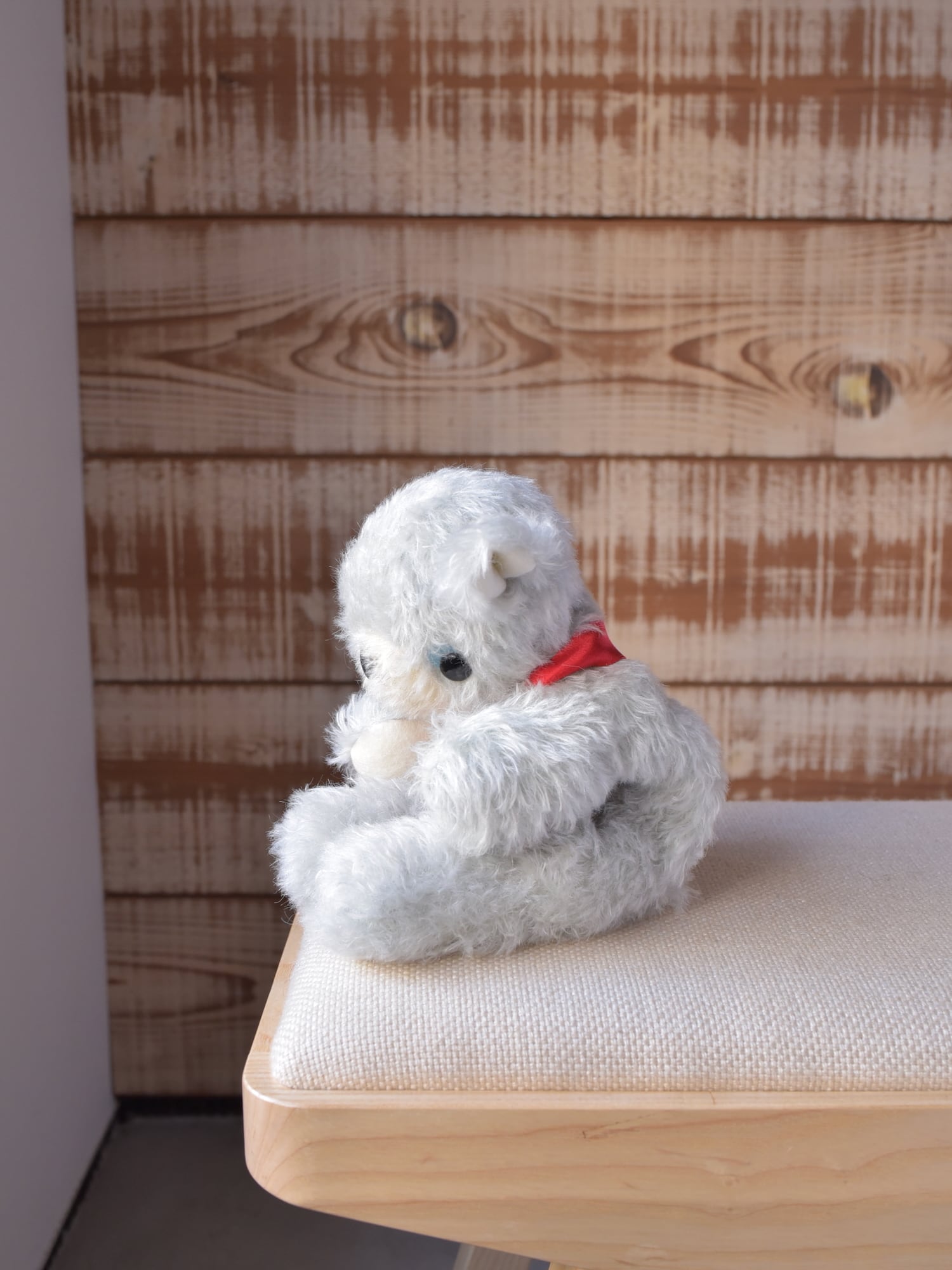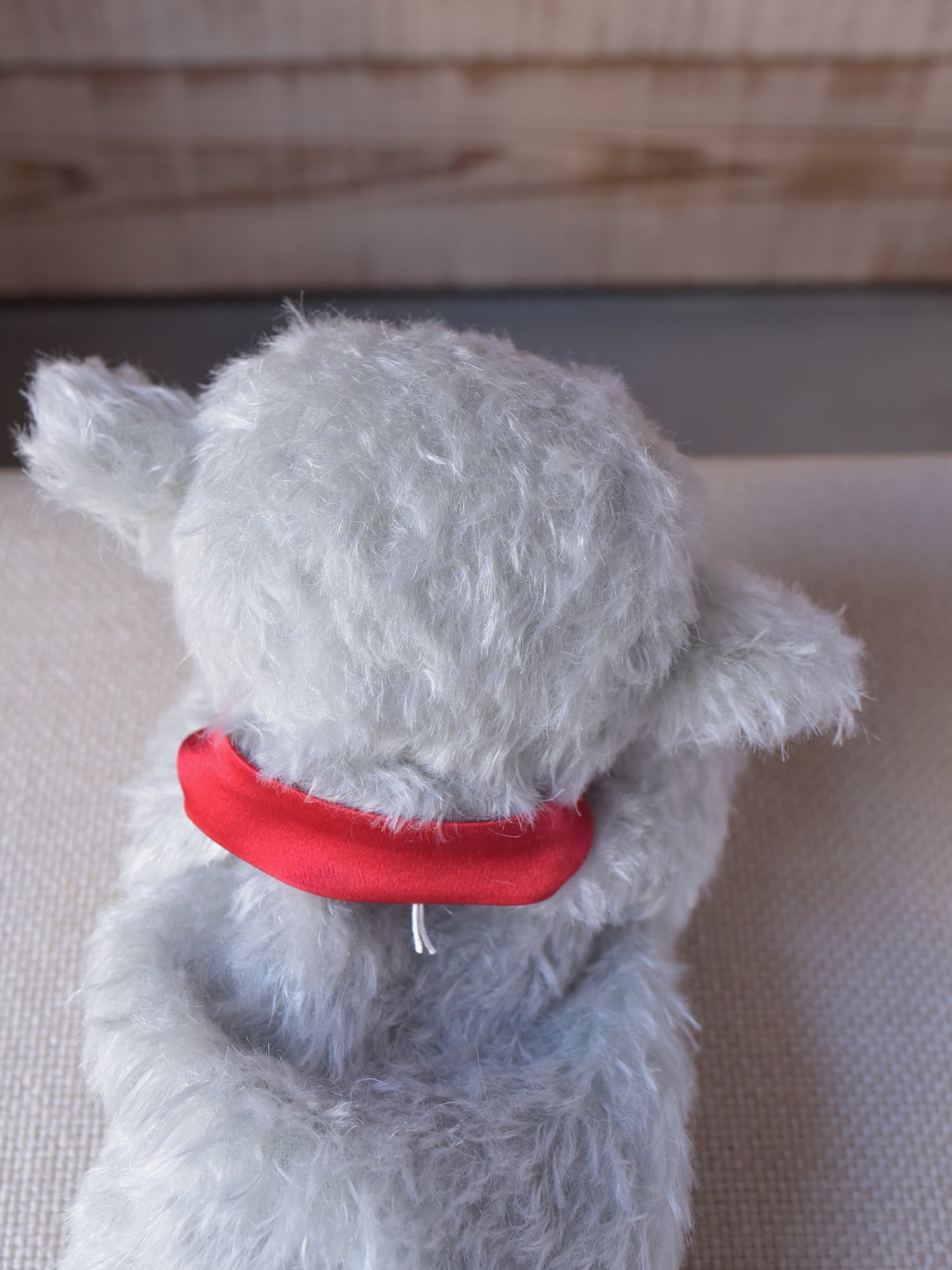 縮れ毛タイプのモヘア(アクア)に赤いシルクマフラーを合わせました。お口部分は短いタイプのモヘアを使用(ところどころでに黒い毛が混じります)。手や耳内、尻尾の内側は白色のドイツ製羊毛フェルトです。※今回の生地はカールが弱めです。