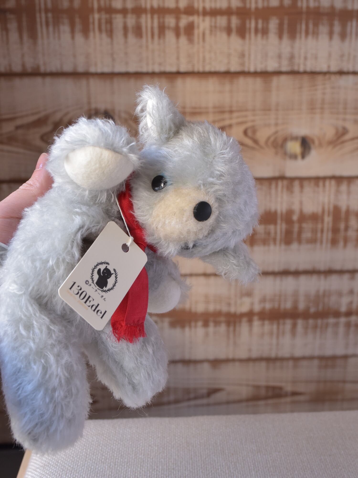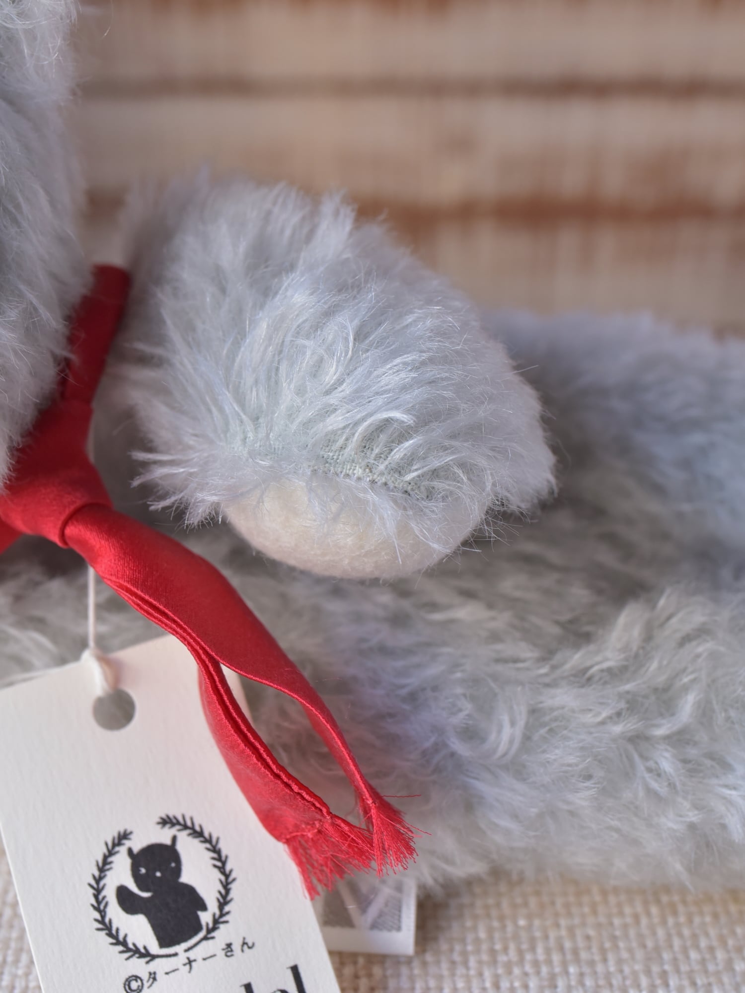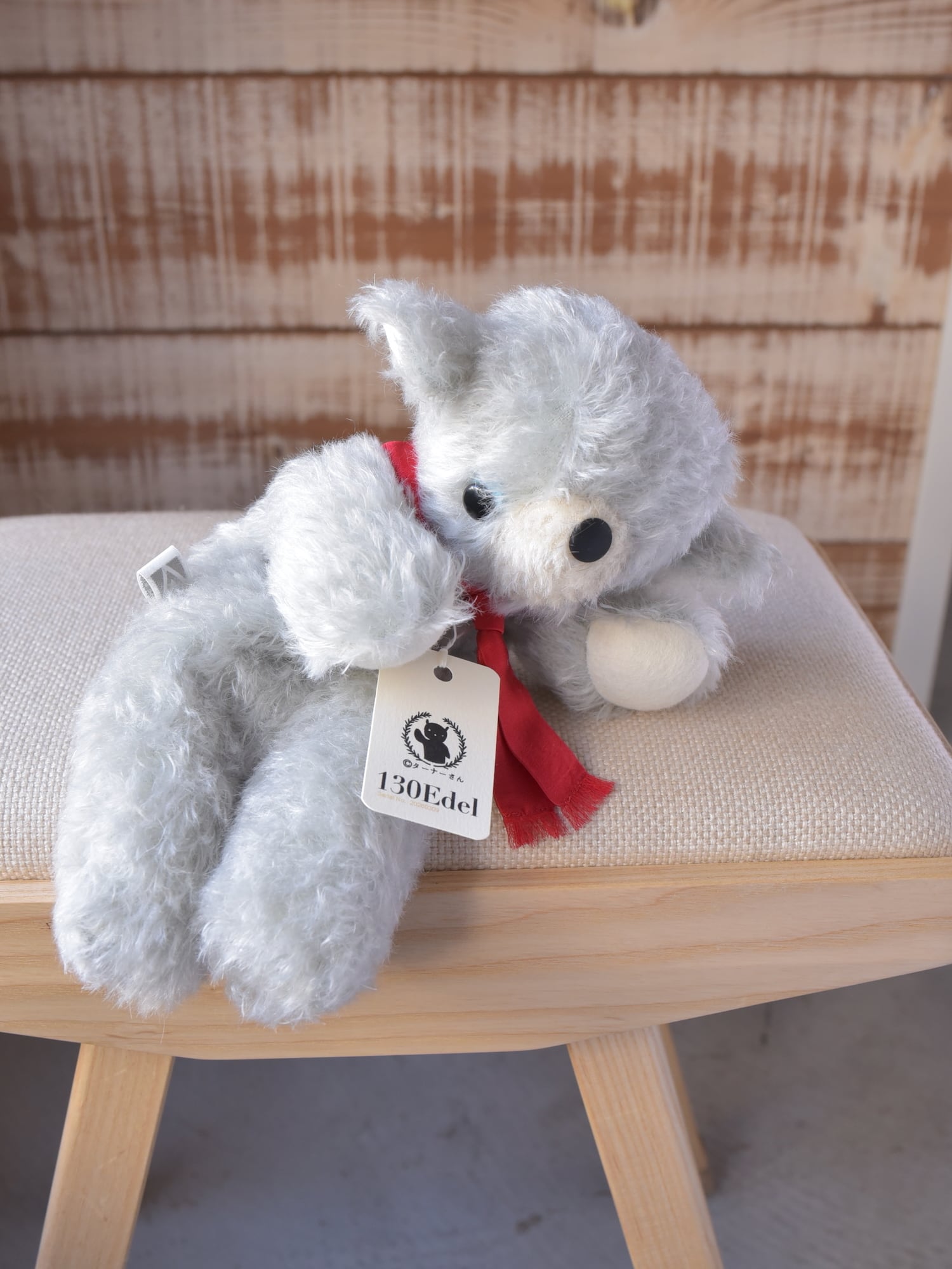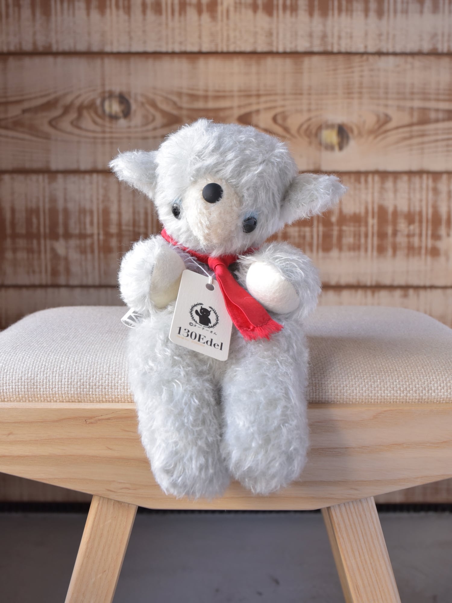 材料も最高級のものをセレクト。シュタイフシュルテ社のモヘア生地(アンゴラ山羊毛)、ドイツ製羊毛フェルト(青目・手・耳裏・尾裏)、マフラーにはシルク100%のサテン生地を使用しています。※目や鼻は「130」と同じプラスチック製ボタンを使用しています。
