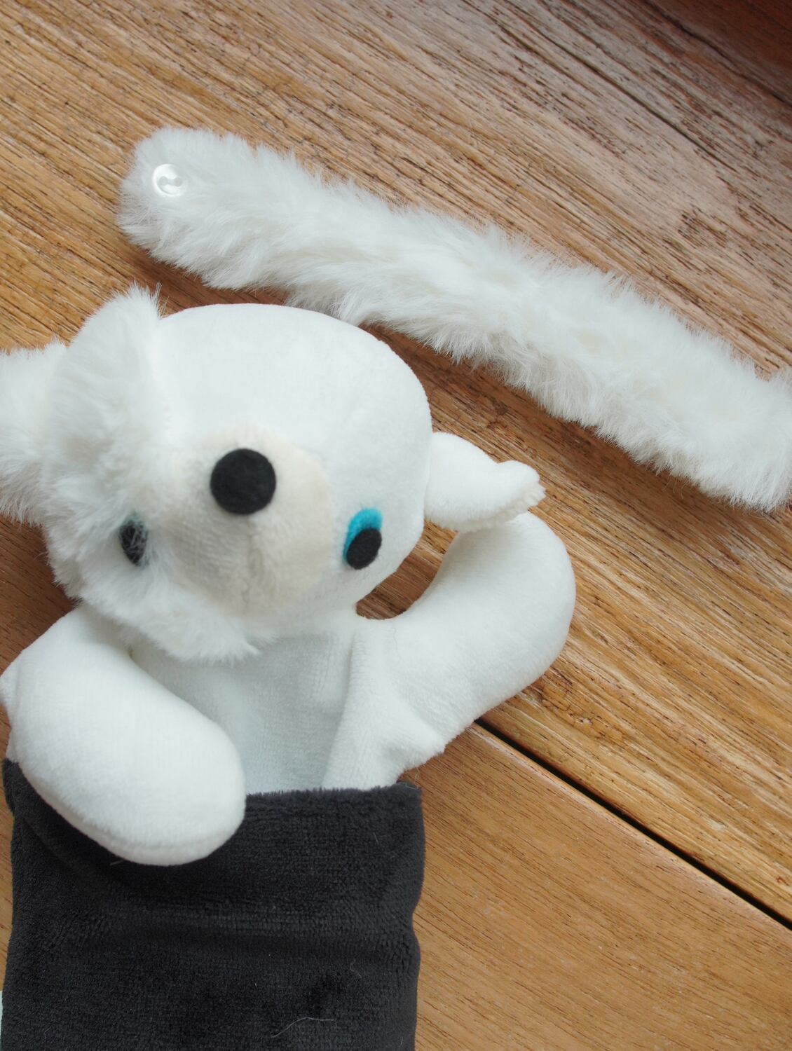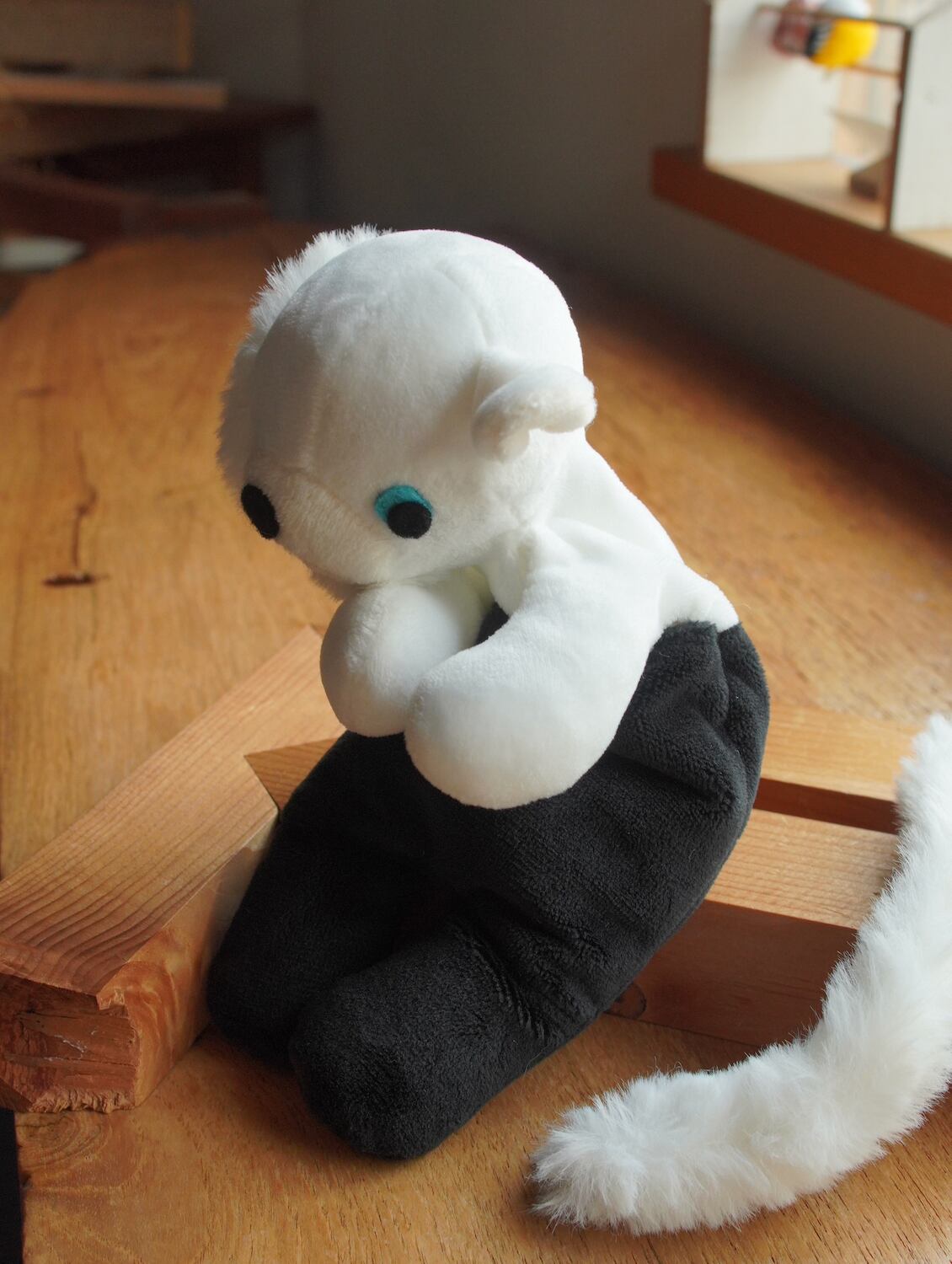 ブラックのオーバーパンツにホワイトのシンプルなボディ+お顔の一部分にモコモコが融合しているキメラタイプとなっております。左右の目の色も違ってますね-