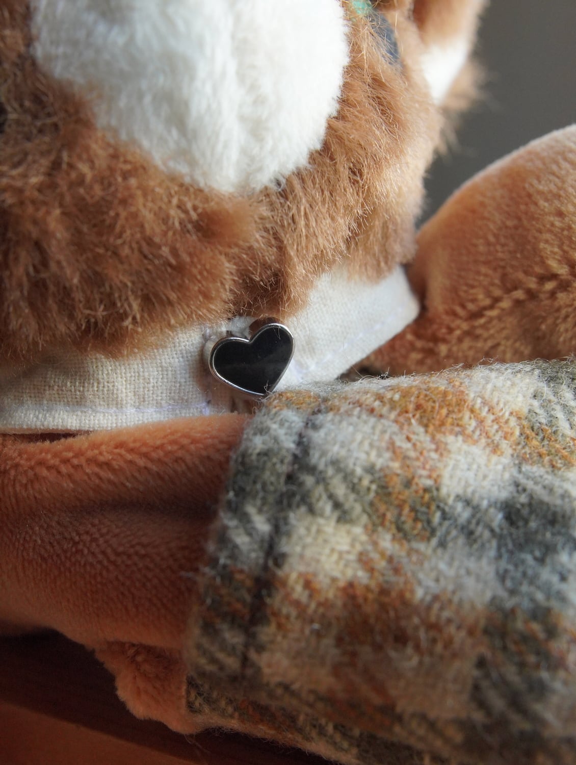 首元にはネーミングの由来、ブラックハートの飾りボタン♡。こちらのキャメルはつけ襟仕様です。首元から爪先まで、やさしい色合いでの統一感、「こだわりのほっこりコーデ」です。