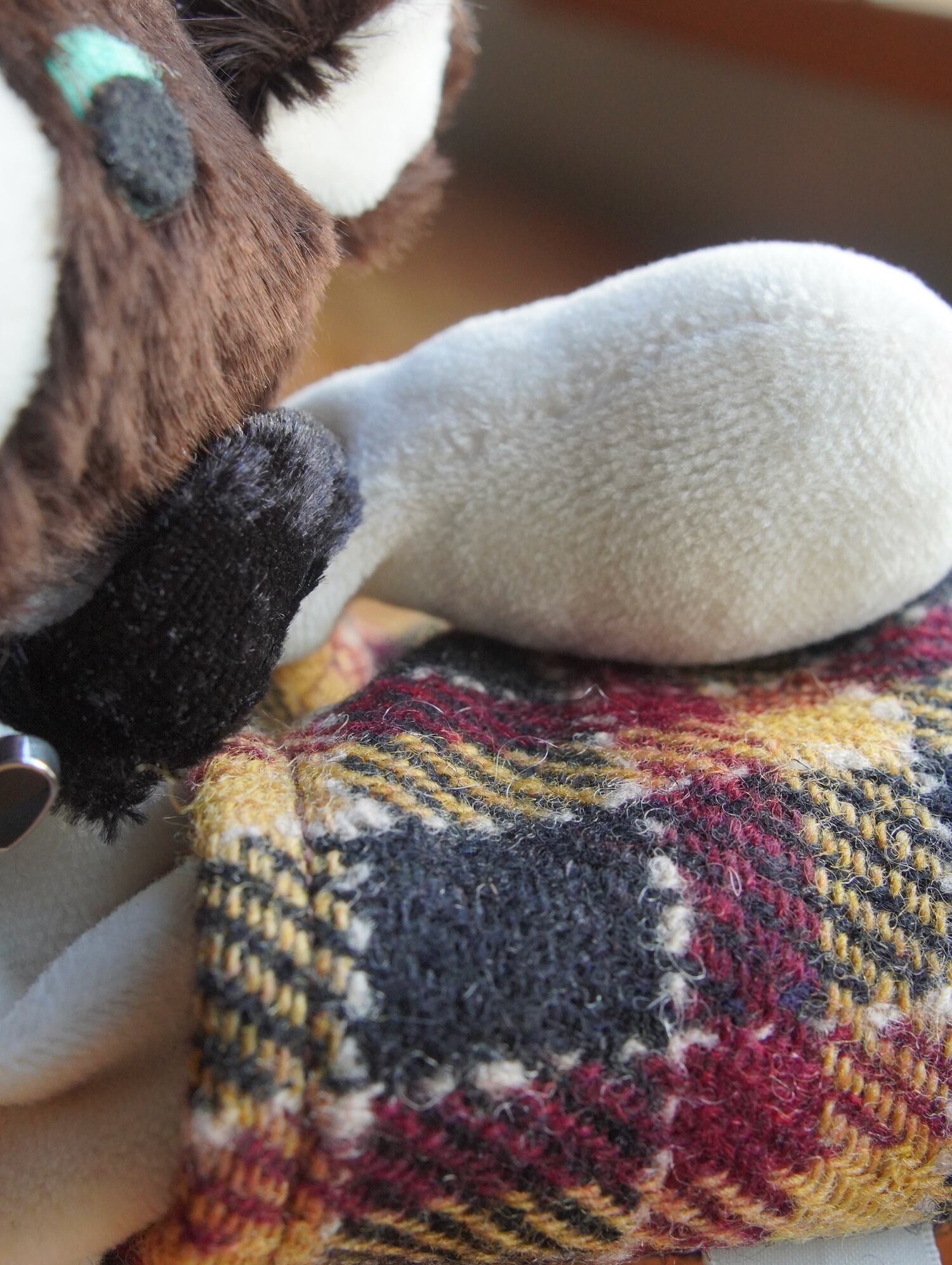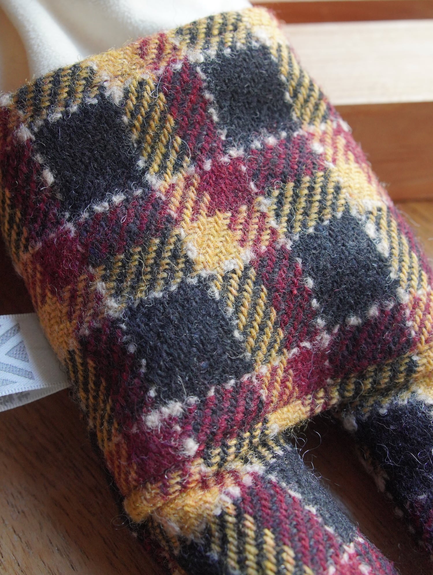 こちらのウール生地(ウール70%)はブラック×イエローにワインレッドのラインと白のステッチがお洒落なチェック柄です。上半身は独特の「服着てます感」がキュートと話題の「切り替え」になっており、ウール生地となめらか生地どちらの手触り、雰囲気も楽しめるデザインとなっております。