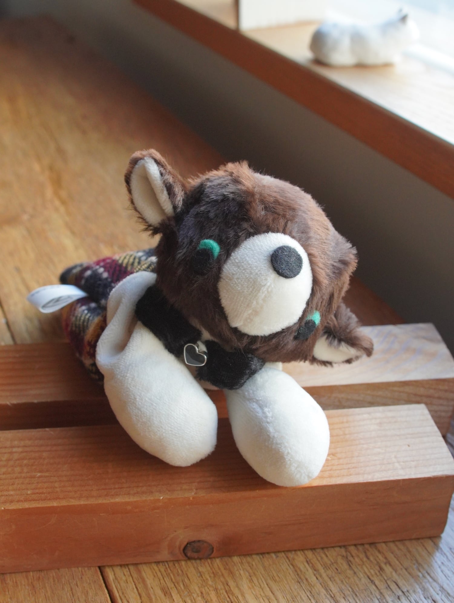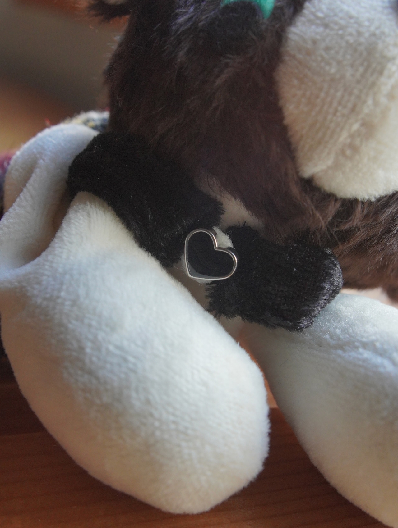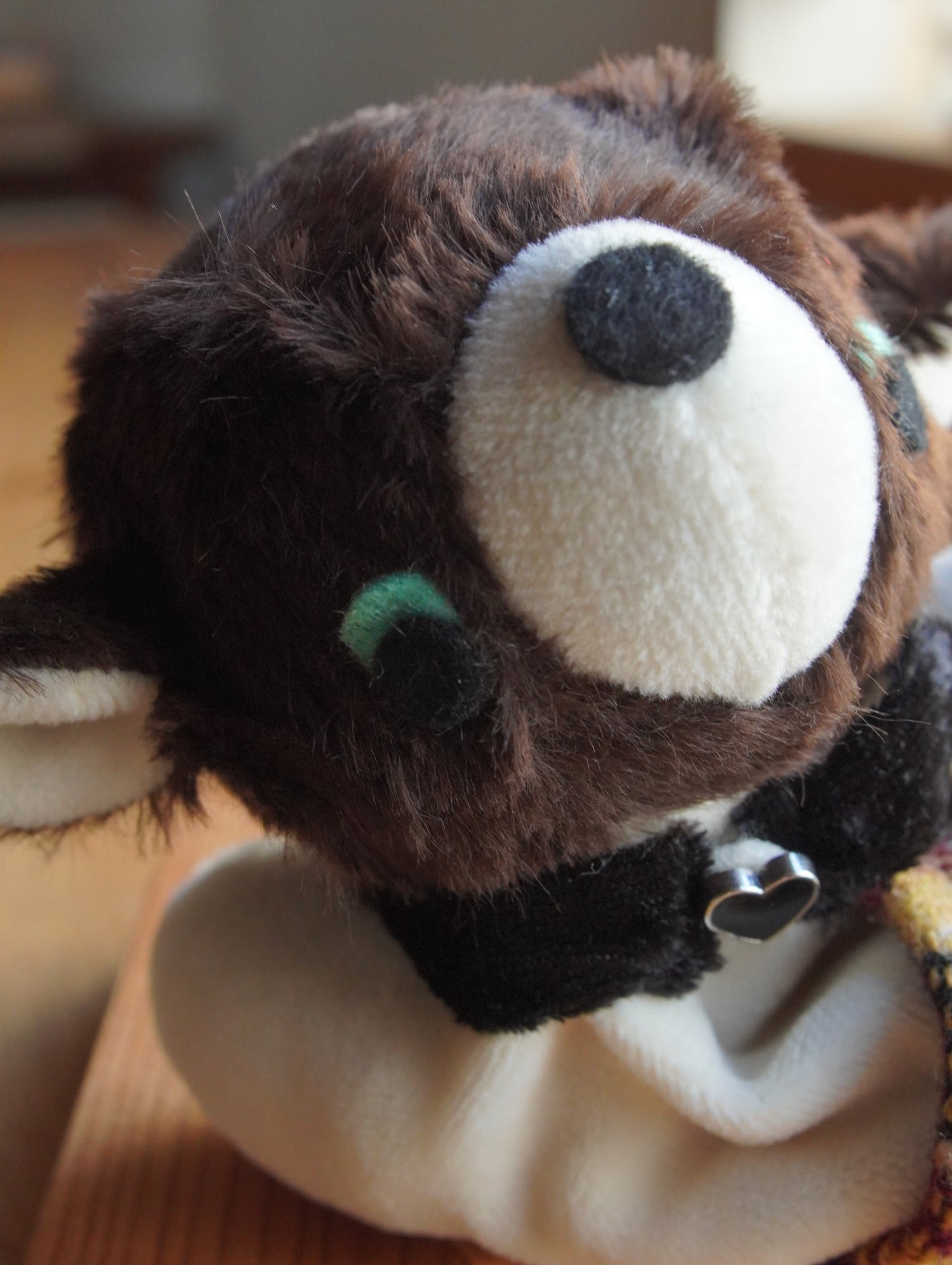 首元にはネーミングの由来、ブラックハートの飾りボタン♡。艶感のあるブラックベロアの付け襟がキリリとコーデを引き締め、いいとこの坊ちゃん感を演出。お顔は「Royてて」と同じ、撫で心地の良いブラウンのファーを使用していますナデナデ☆