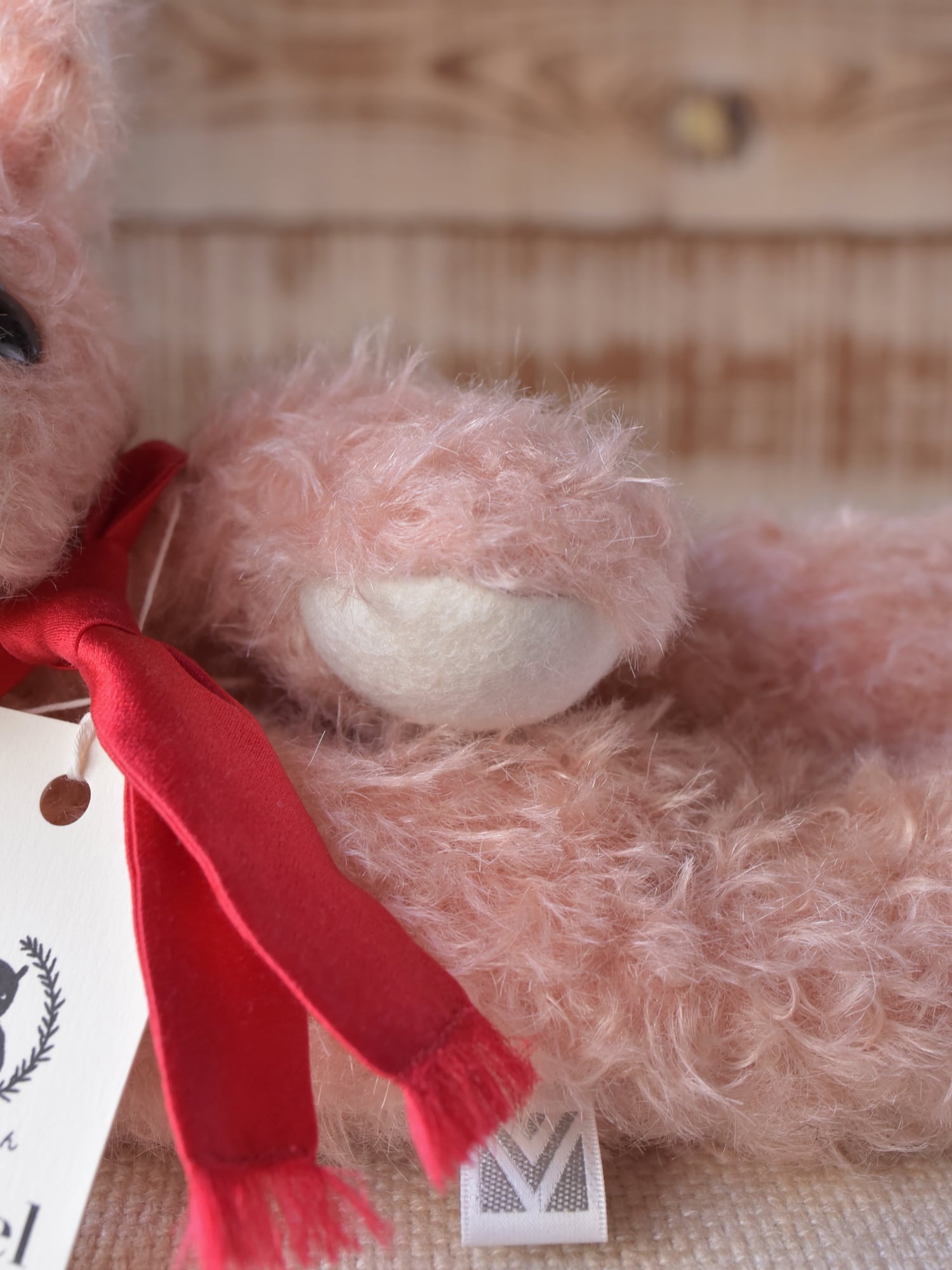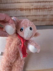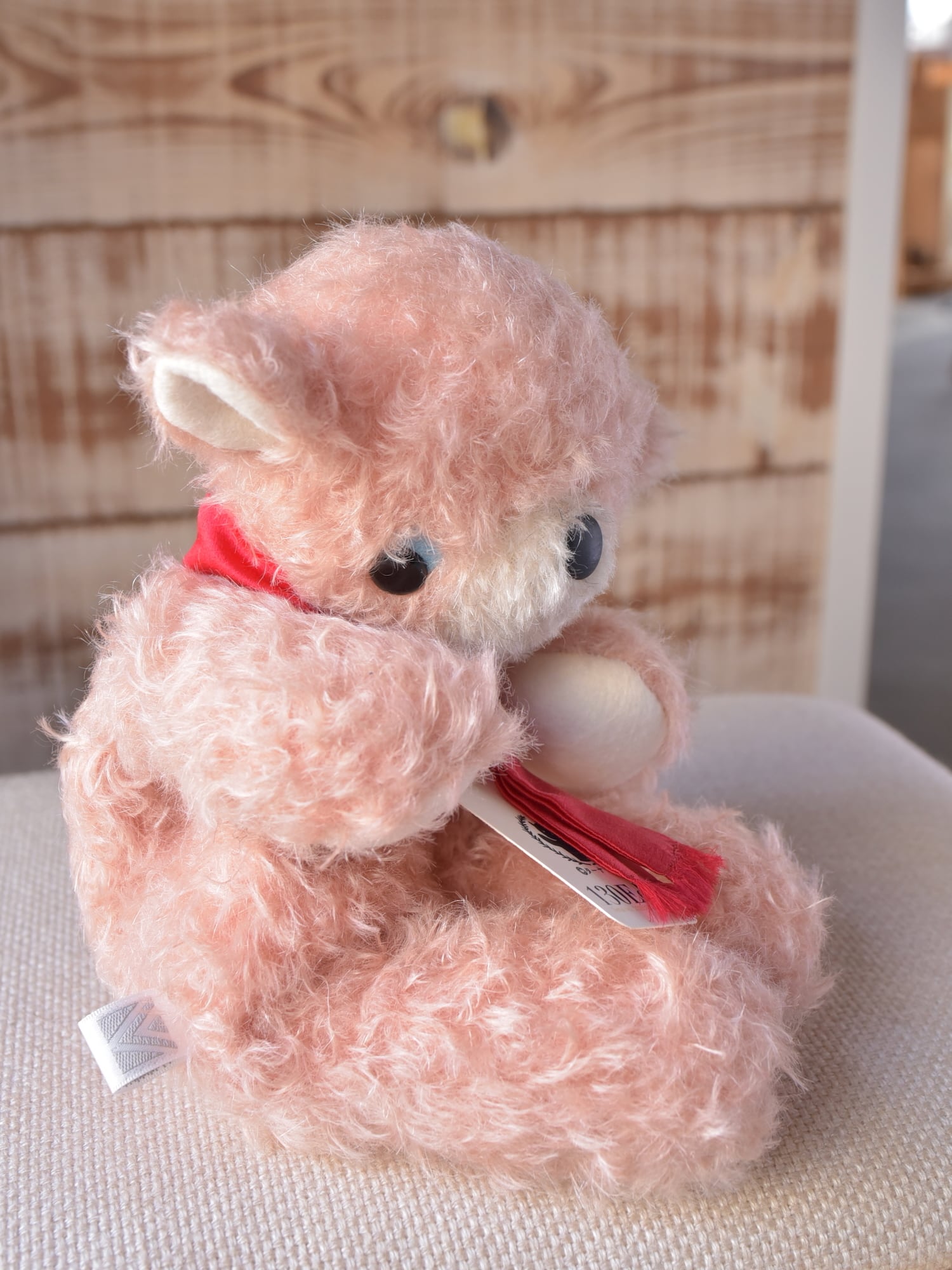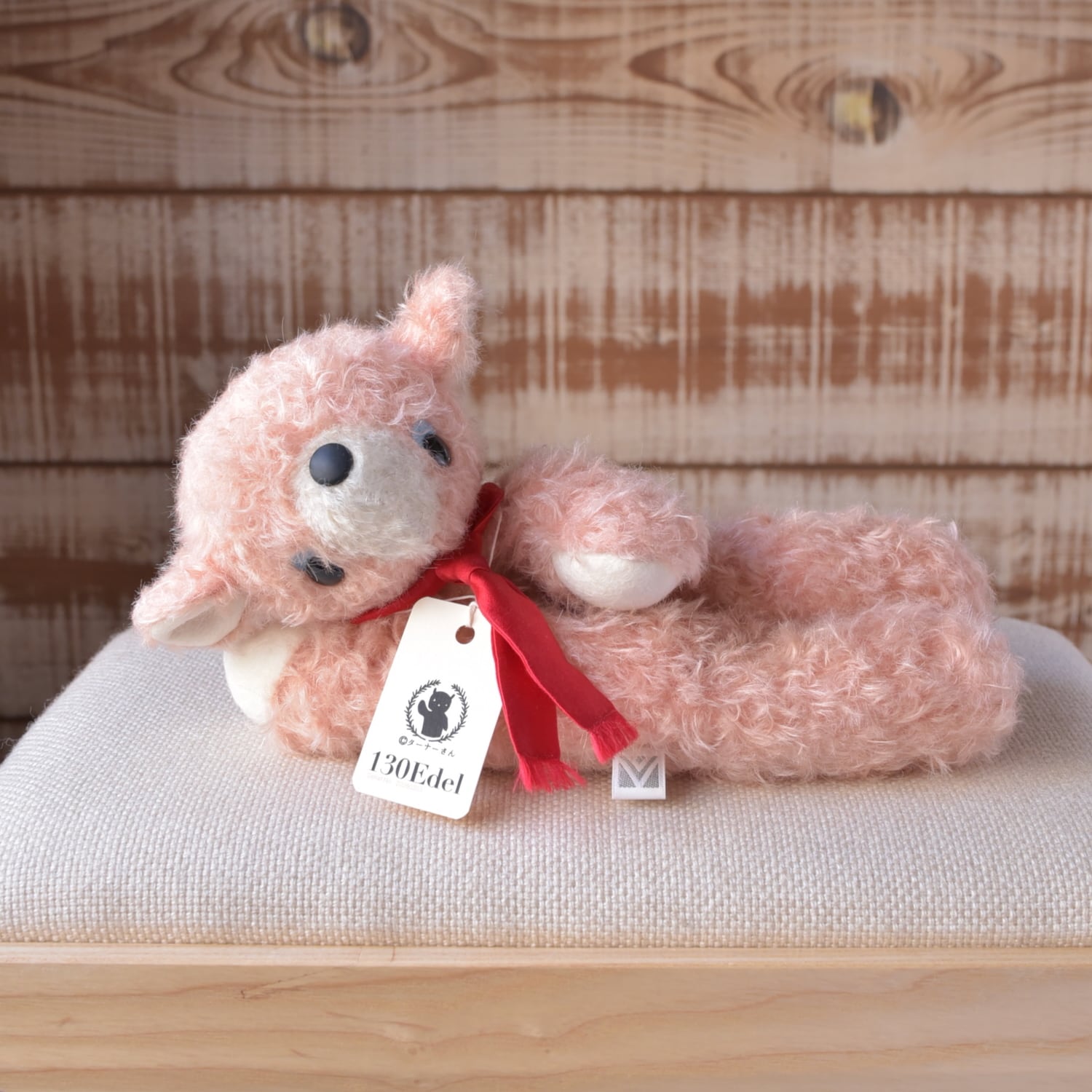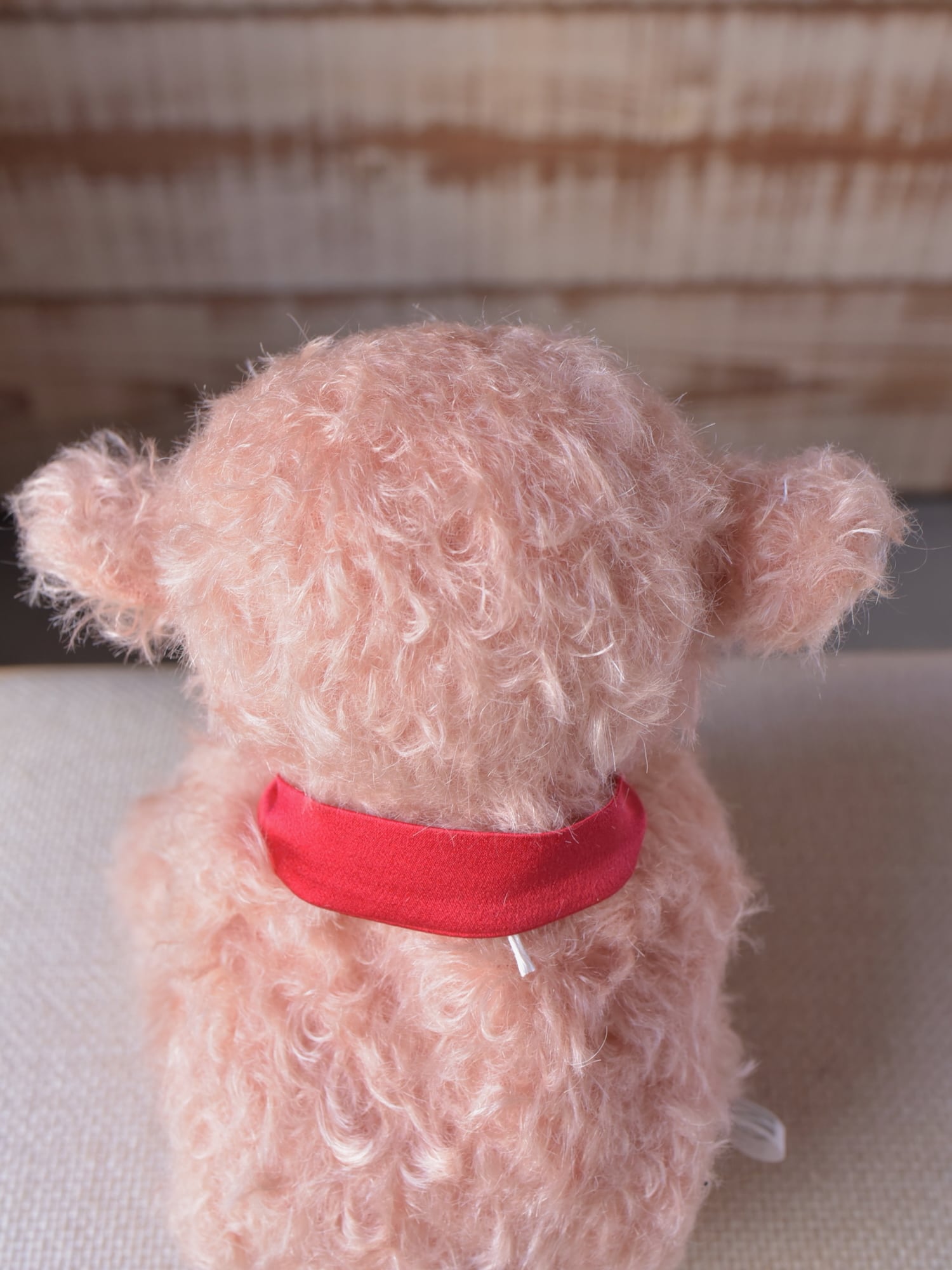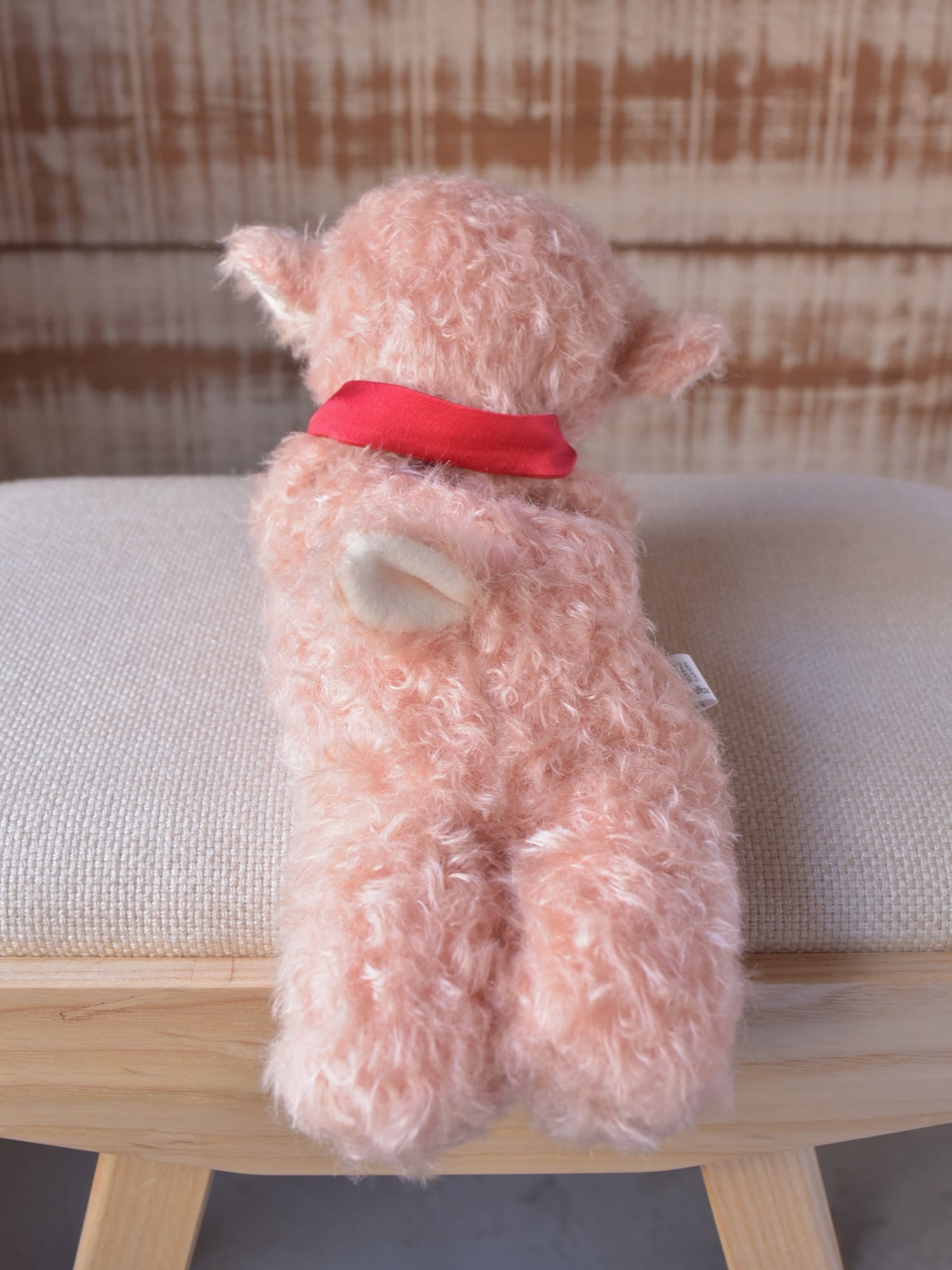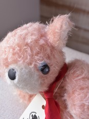 縮れ毛タイプのモヘア(サーモン)に赤いシルクマフラーを合わせました。お口部分は短いタイプのモヘアを使用(ところどころでに黒い毛が混じります)。手や耳内、尻尾の内側は白色のドイツ製羊毛フェルトです。