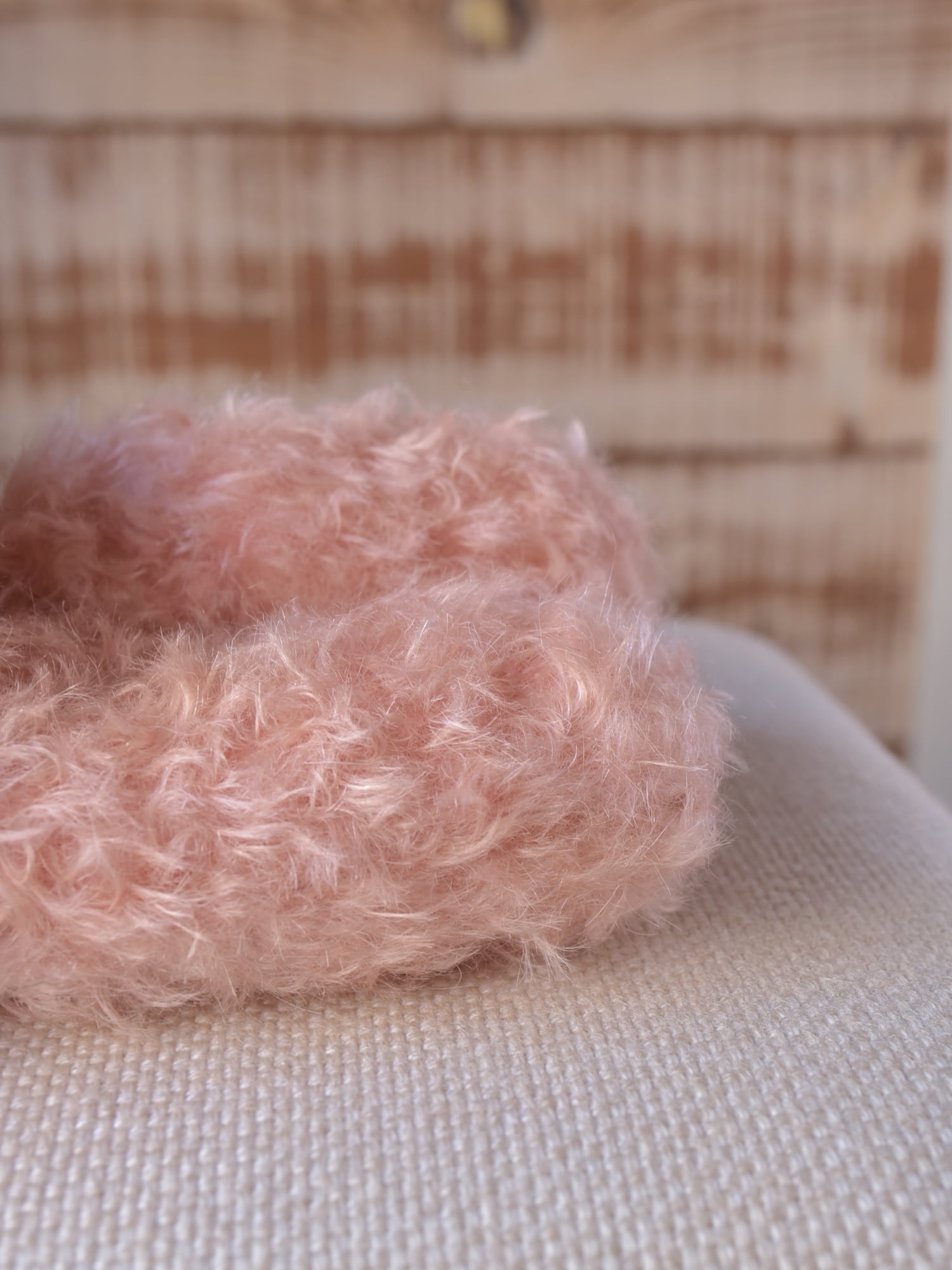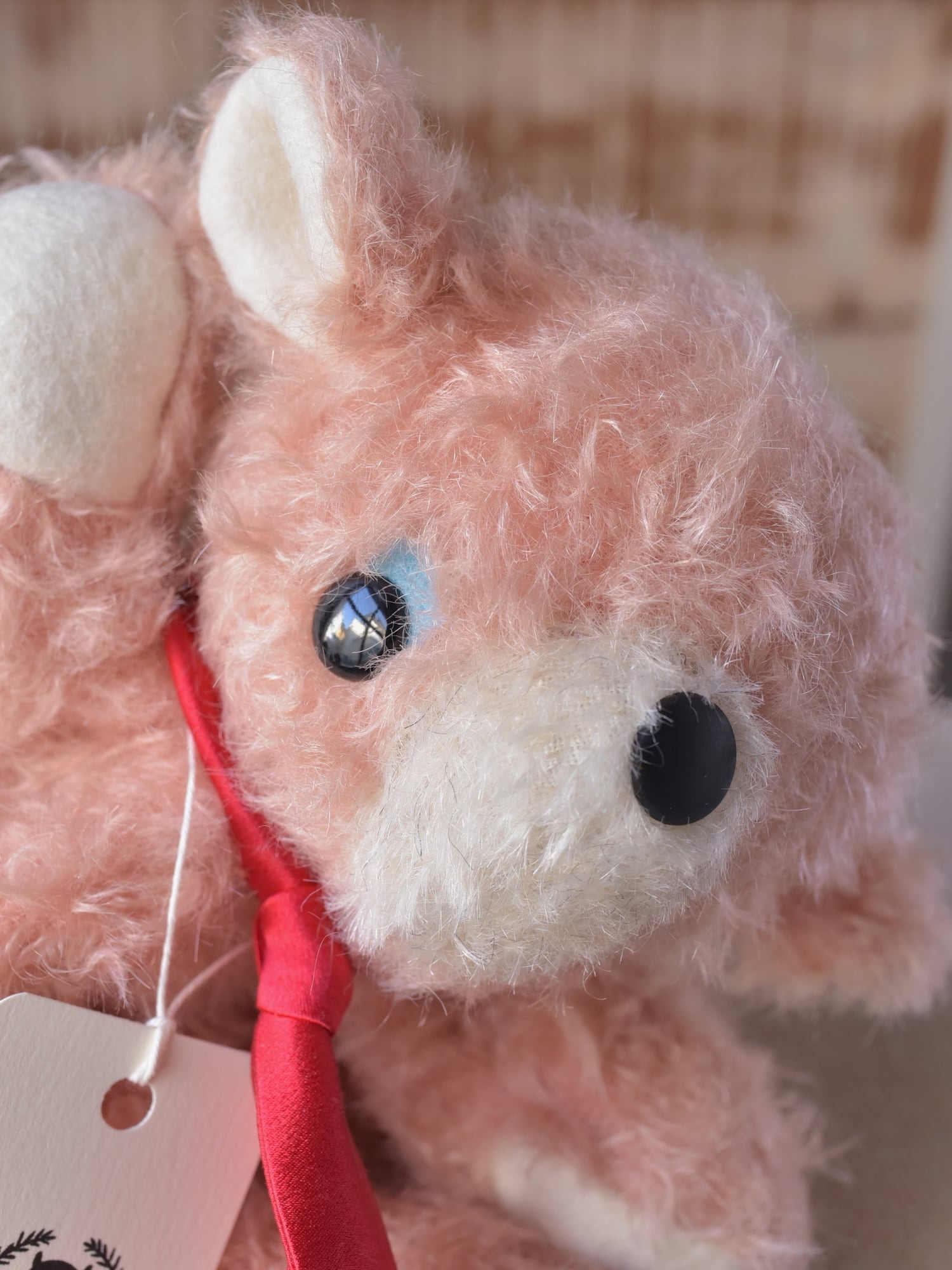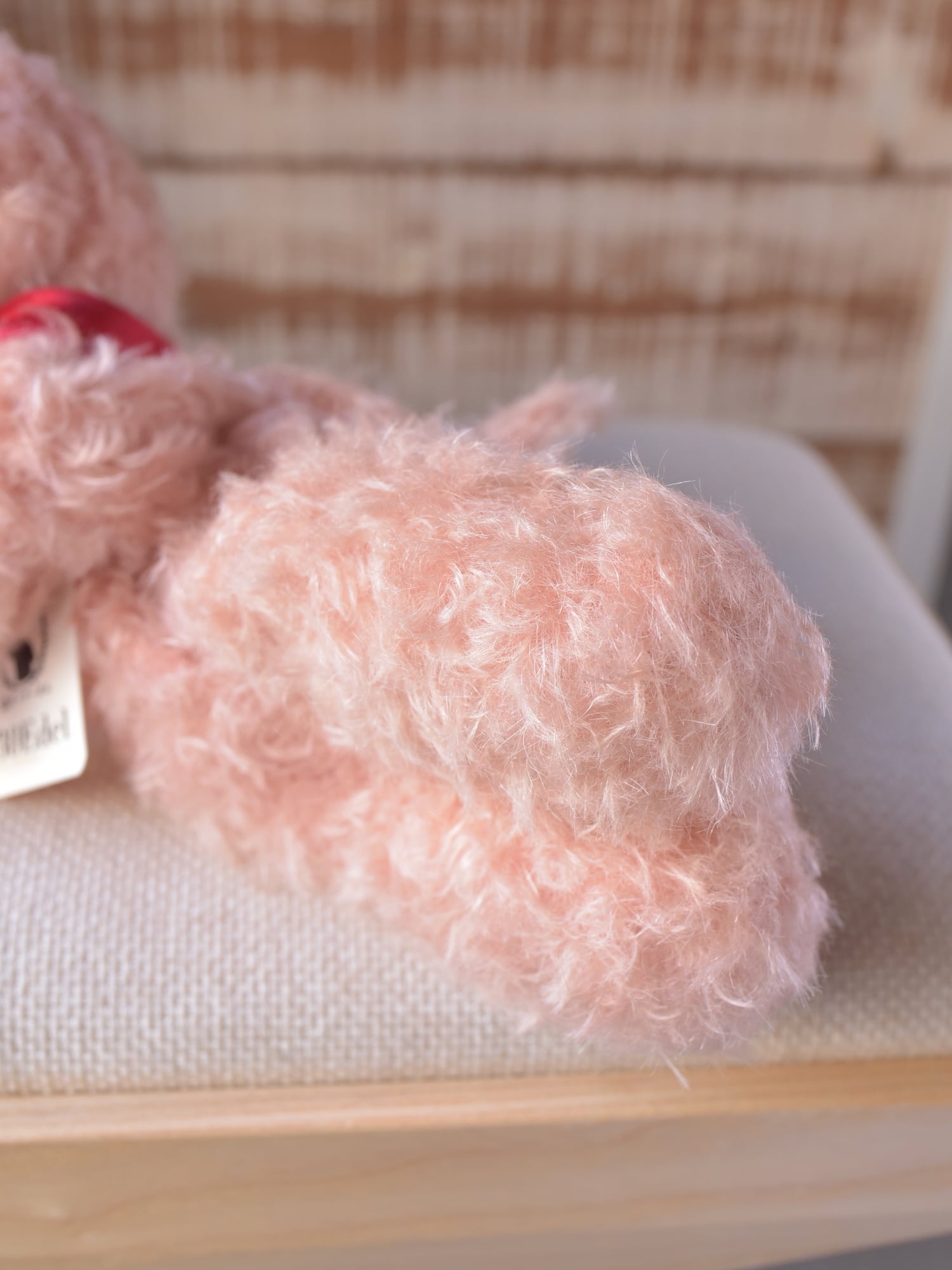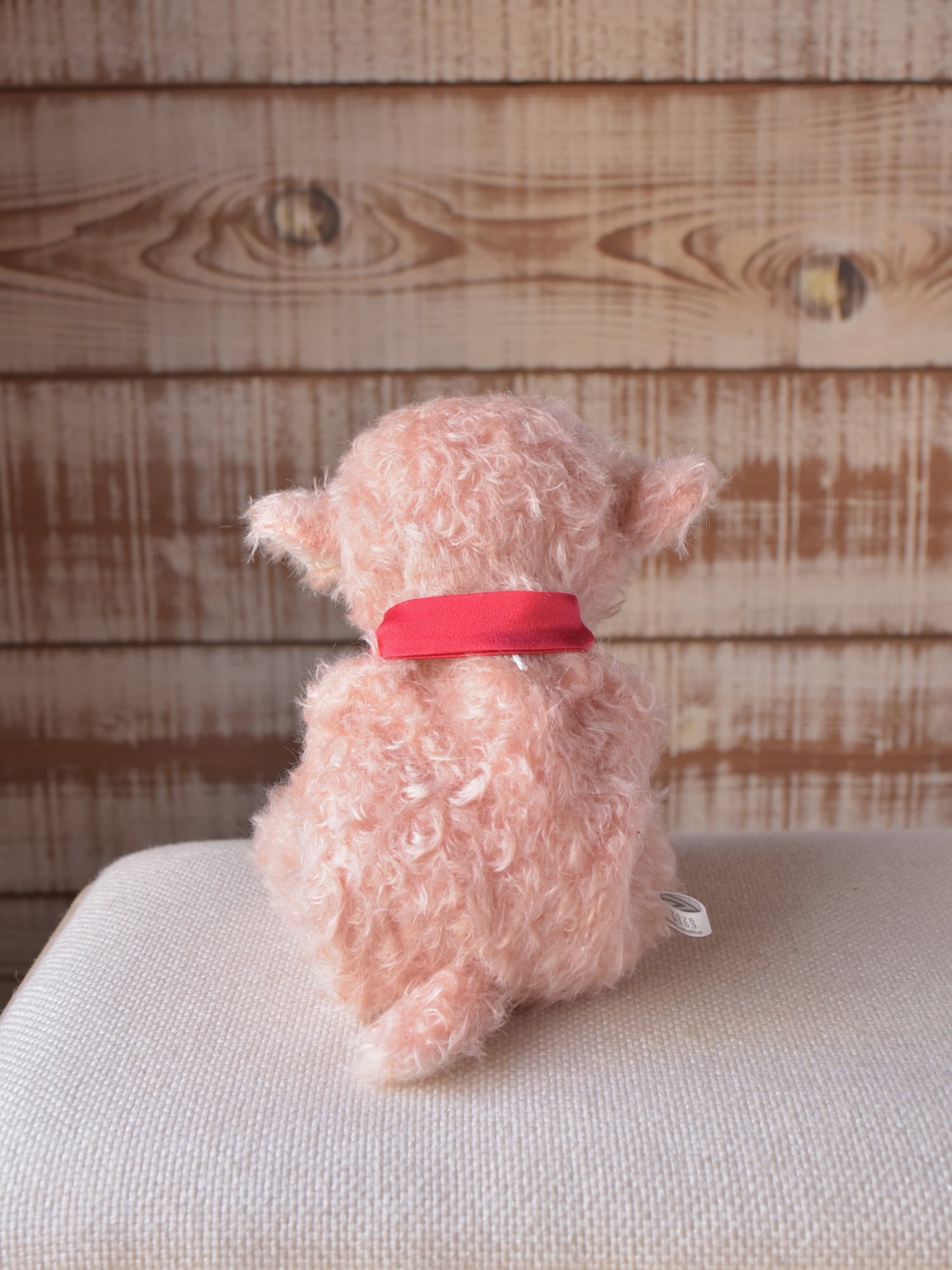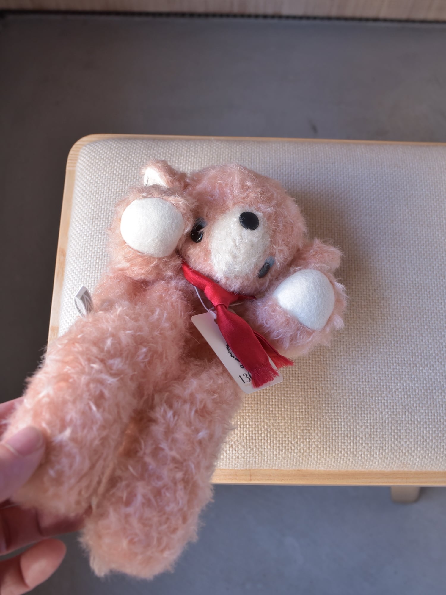縮れ毛タイプのモヘア(サーモン)に赤いシルクマフラーを合わせました。お口部分は短いタイプのモヘアを使用(ところどころでに黒い毛が混じります)。手や耳内、尻尾の内側は白色のドイツ製羊毛フェルトです。