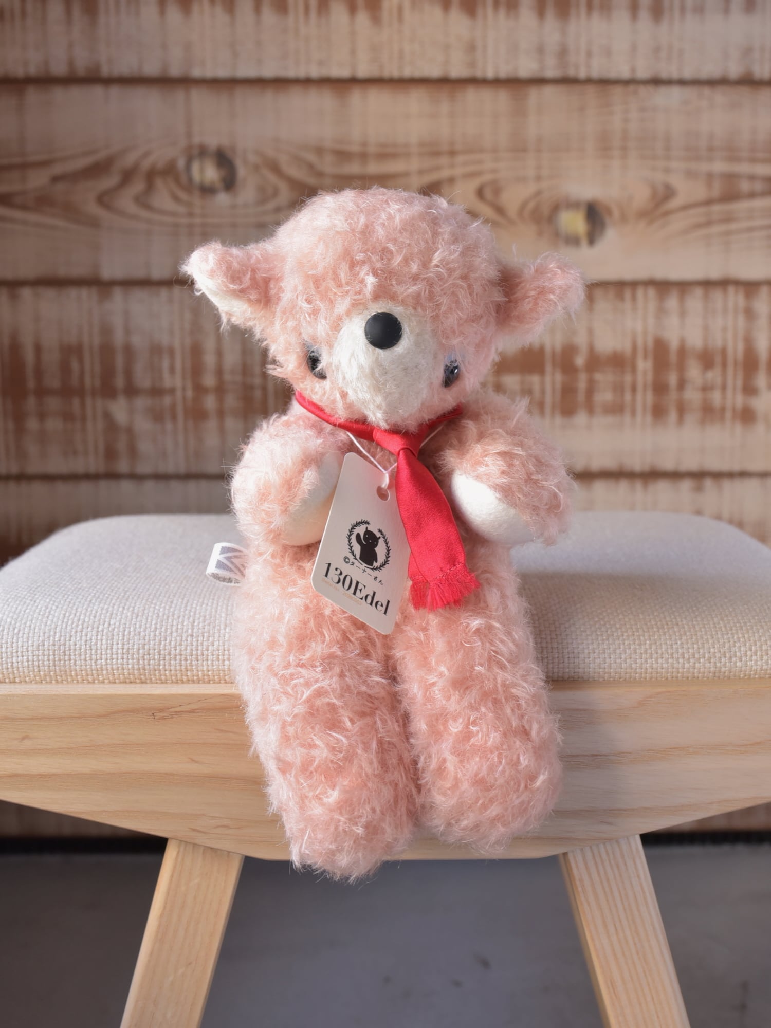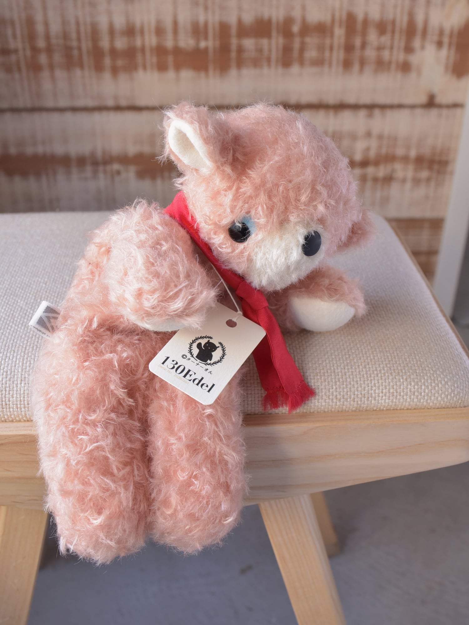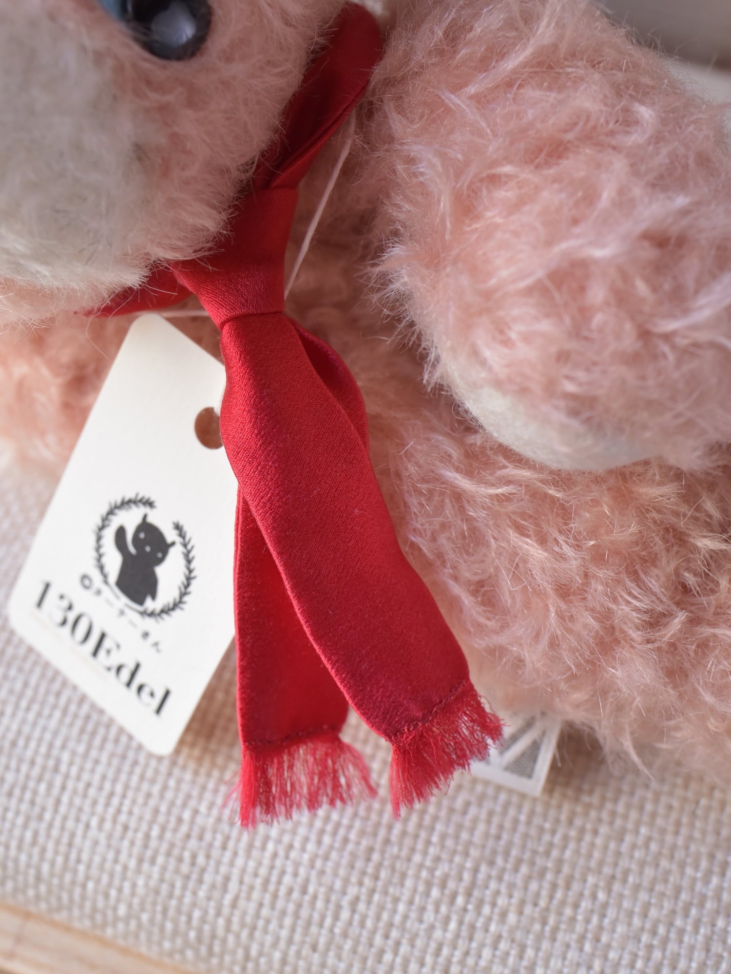 材料も最高級のものをセレクト。シュタイフシュルテ社のモヘア生地(アンゴラ山羊毛)、ドイツ製羊毛フェルト(青目・手・耳裏・尾裏)、マフラーにはシルク100%のサテン生地を使用しています。※目や鼻は「130」と同じプラスチック製ボタンを使用しています。