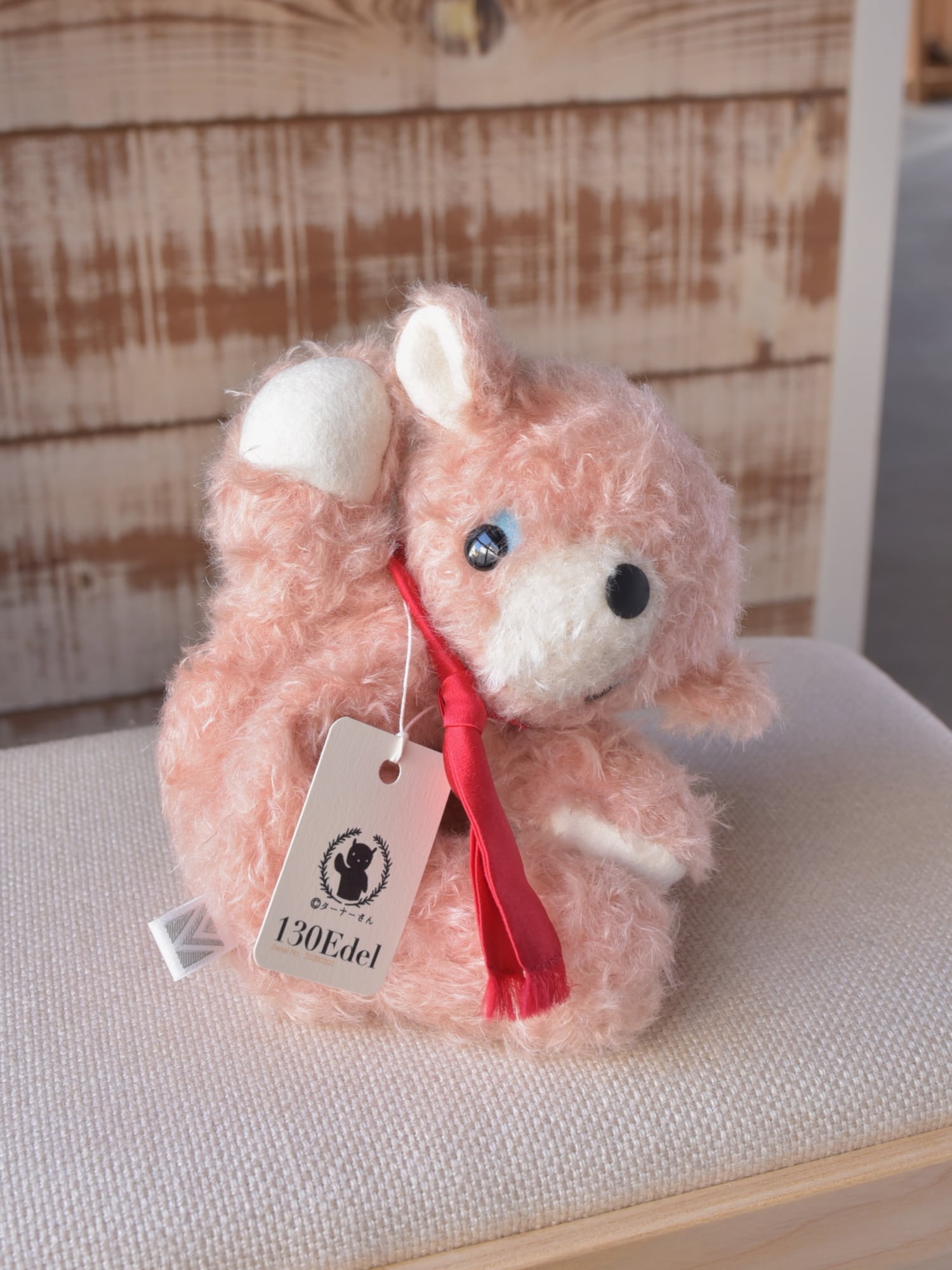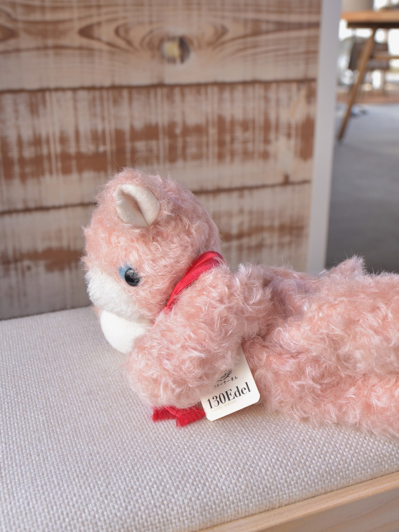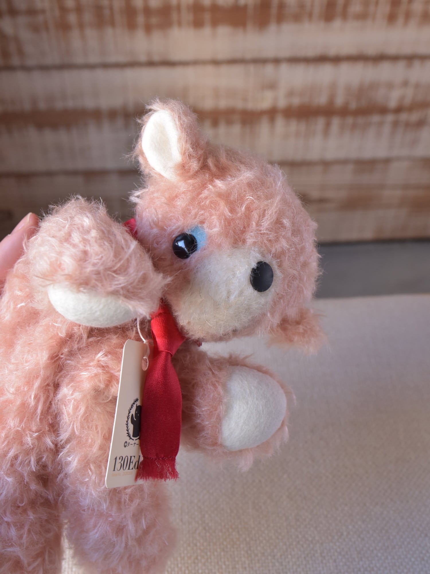 材料も最高級のものをセレクト。シュタイフシュルテ社のモヘア生地(アンゴラ山羊毛)、ドイツ製羊毛フェルト(青目・手・耳裏・尾裏)、マフラーにはシルク100%のサテン生地を使用しています。※目や鼻は「130」と同じプラスチック製ボタンを使用しています。
