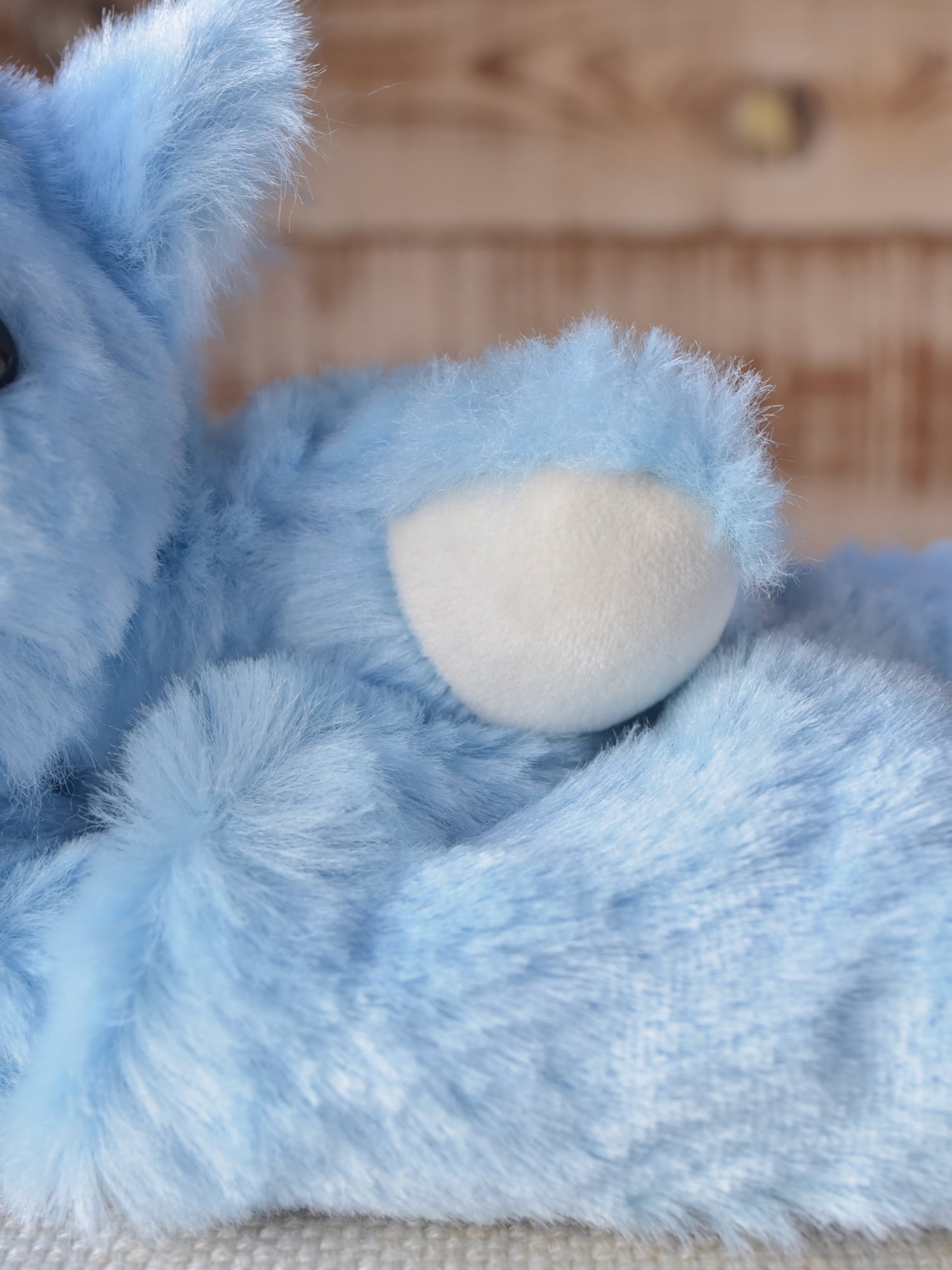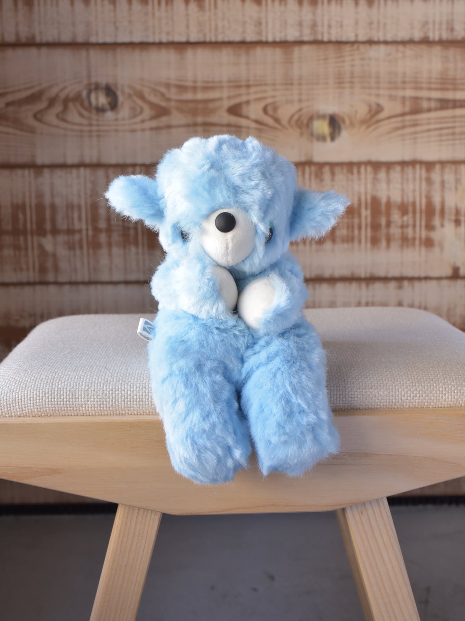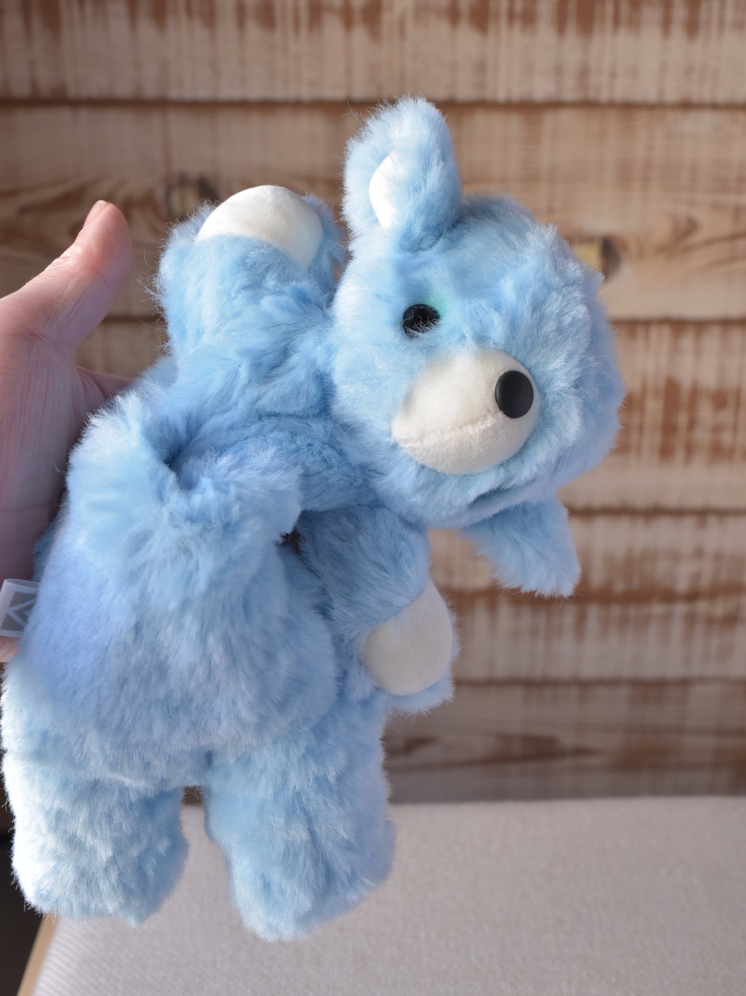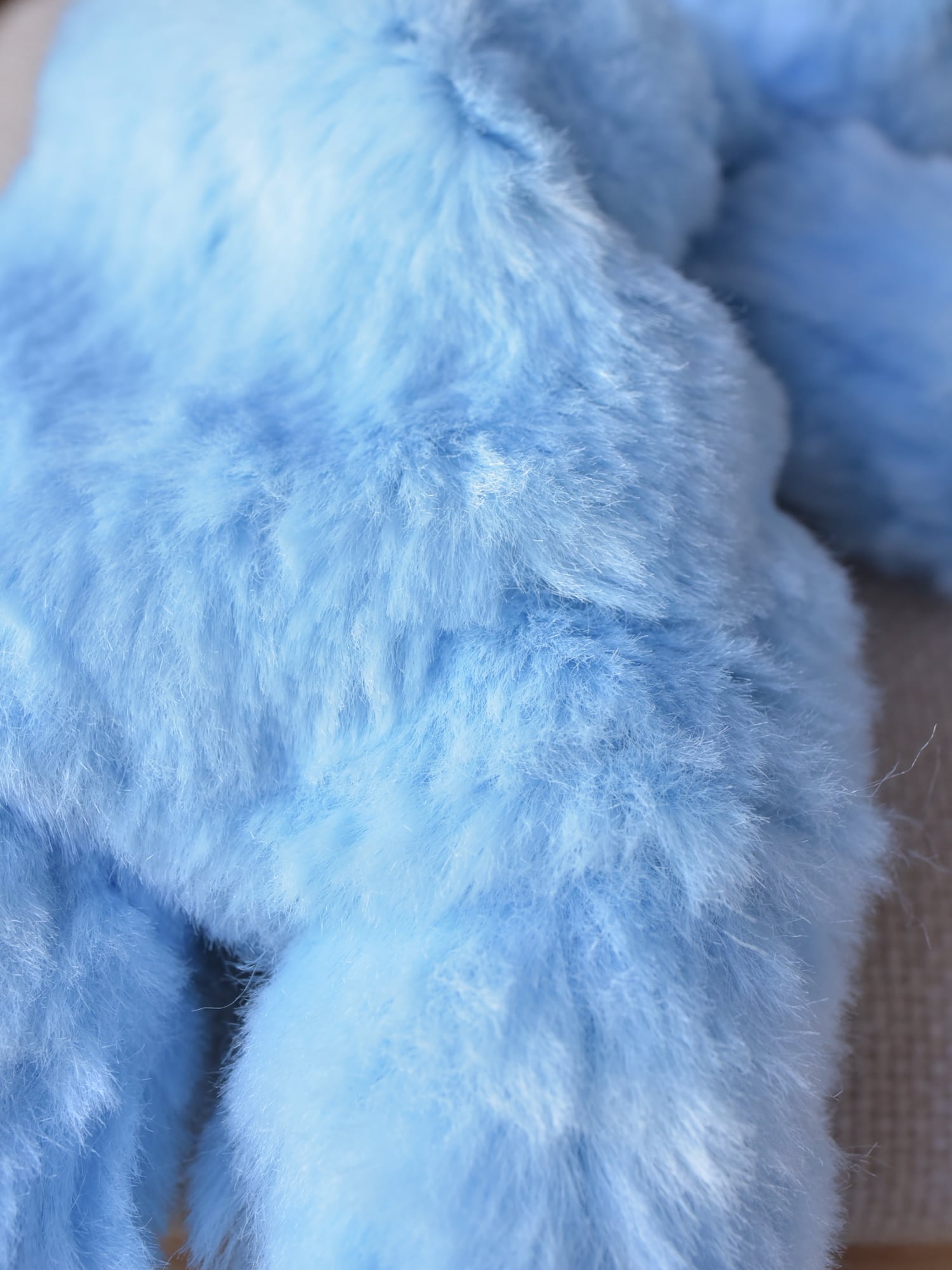 毛足1.2cmと長め、ほぼストレート、手触りやわらかな空色のファーを使用した©︎ターナーさん130です。光が当たっている部分が白く見えますが、単色です。お口と手先、耳としっぽ裏は、なめらか生地のミルク色を使用しています。