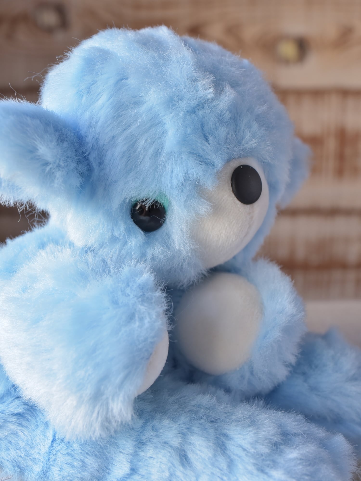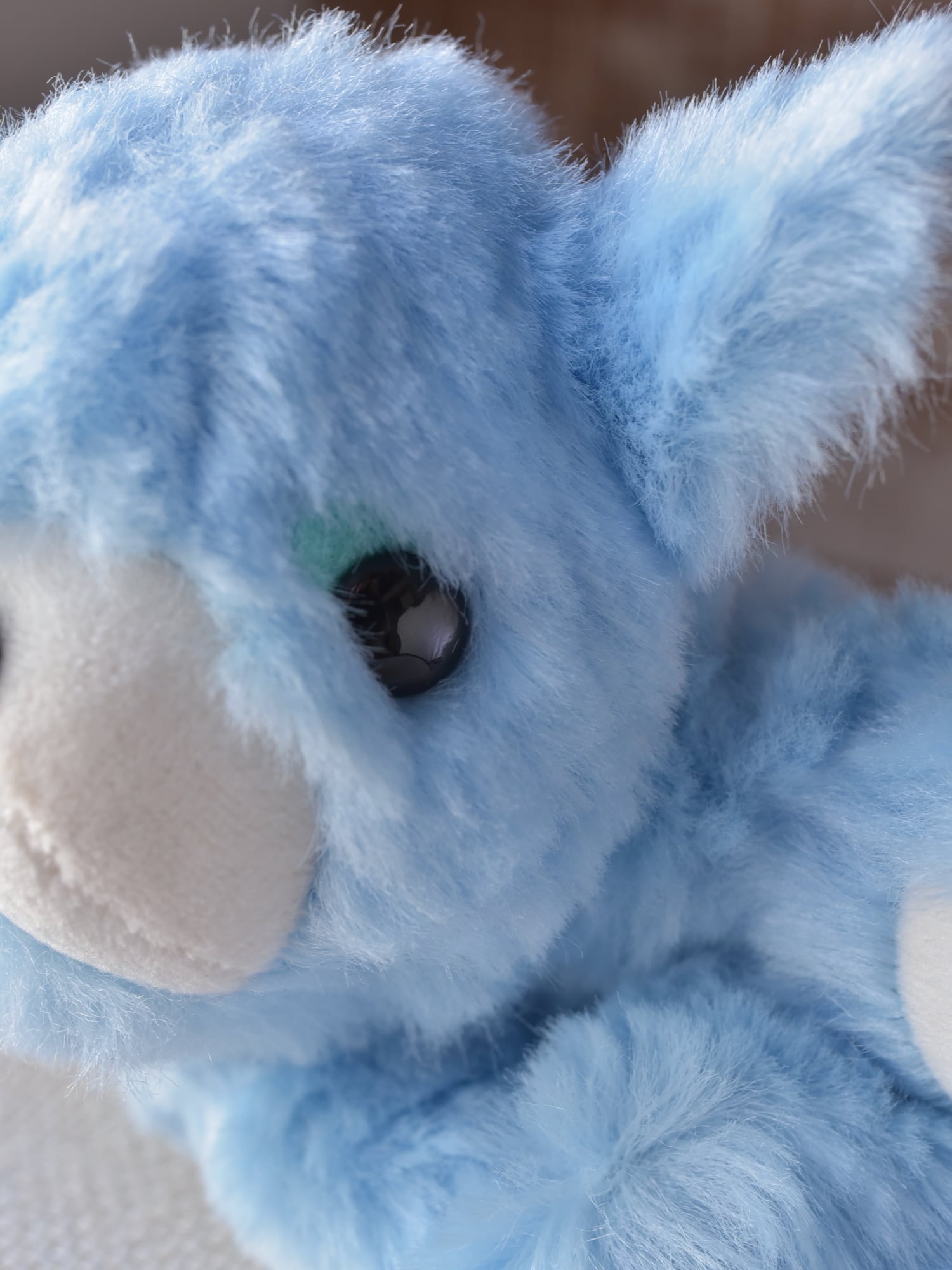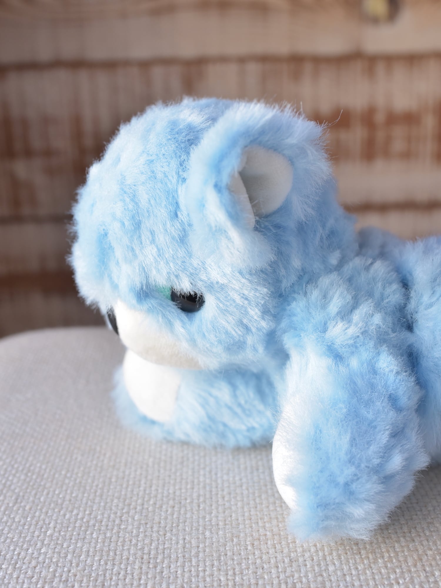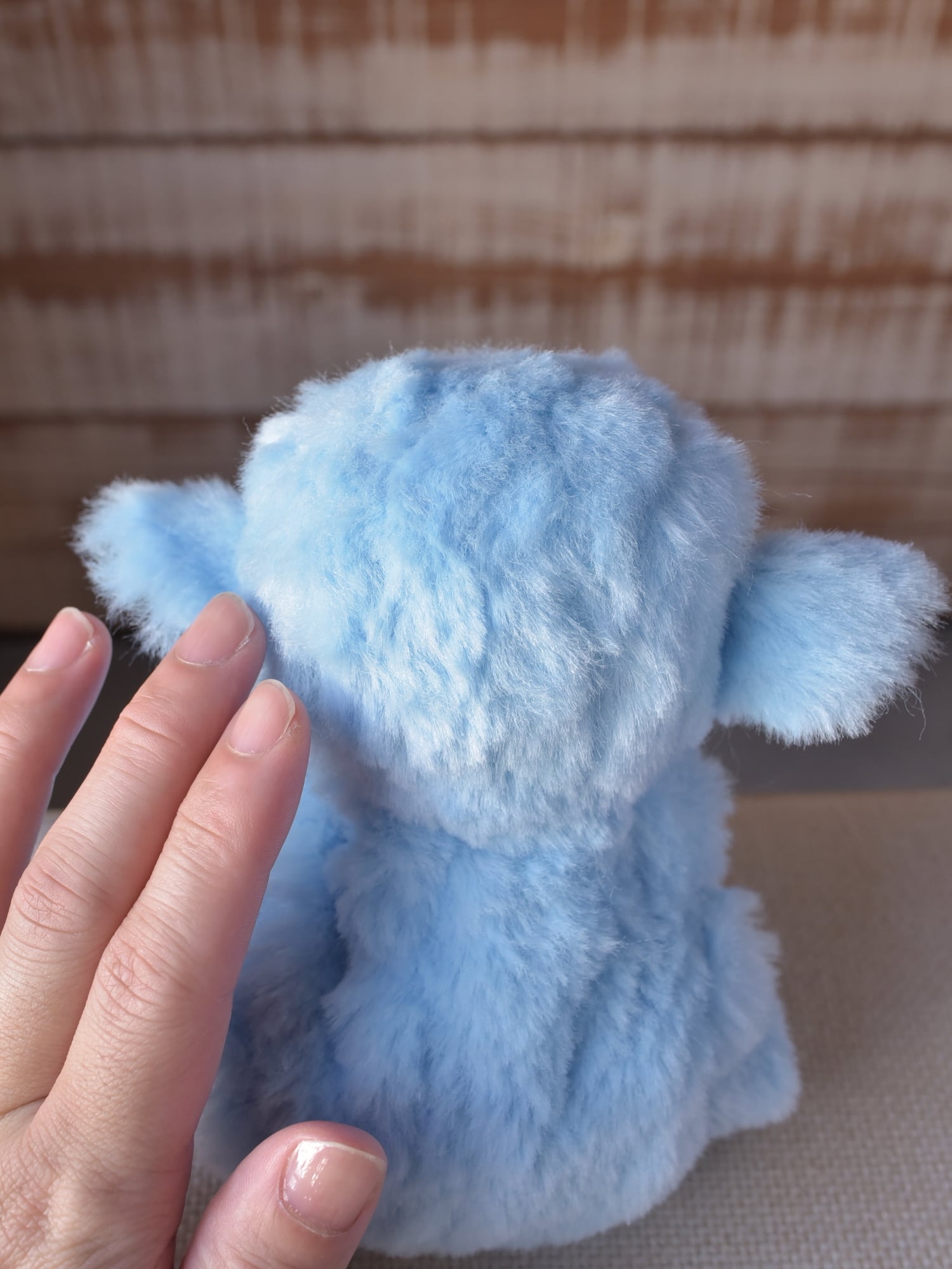 毛足1.2cmと長め、ほぼストレート、手触りやわらかな空色のファーを使用した©︎ターナーさん130です。光が当たっている部分が白く見えますが、単色です。お口と手先、耳としっぽ裏は、なめらか生地のミルク色を使用しています。