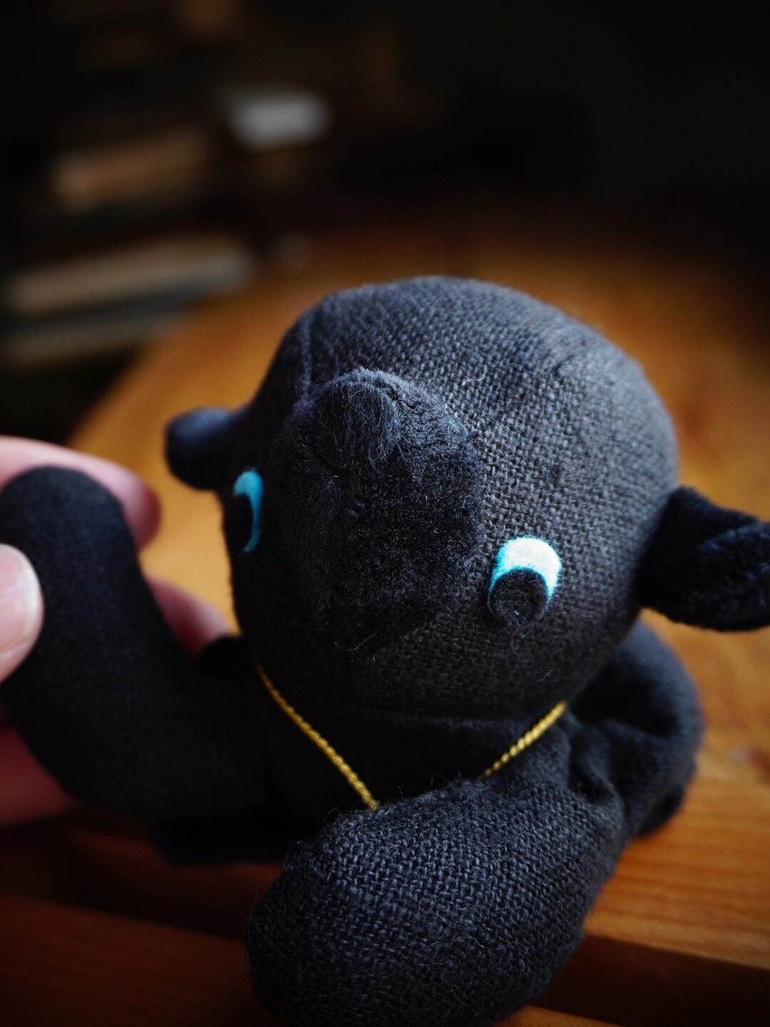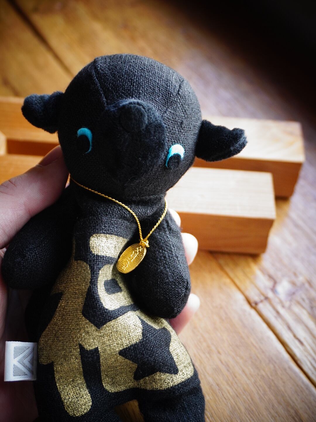 ですがそれでは飽き足らず、お腹にゴールドのハンドプリント「福」、そして「開運厄除」「交通安全」の文字が入った小判型のチャームを豪華にコーデ。黒一色の統一感とゴールドの渋みが見事に馴染み、そこはかとない…実力?