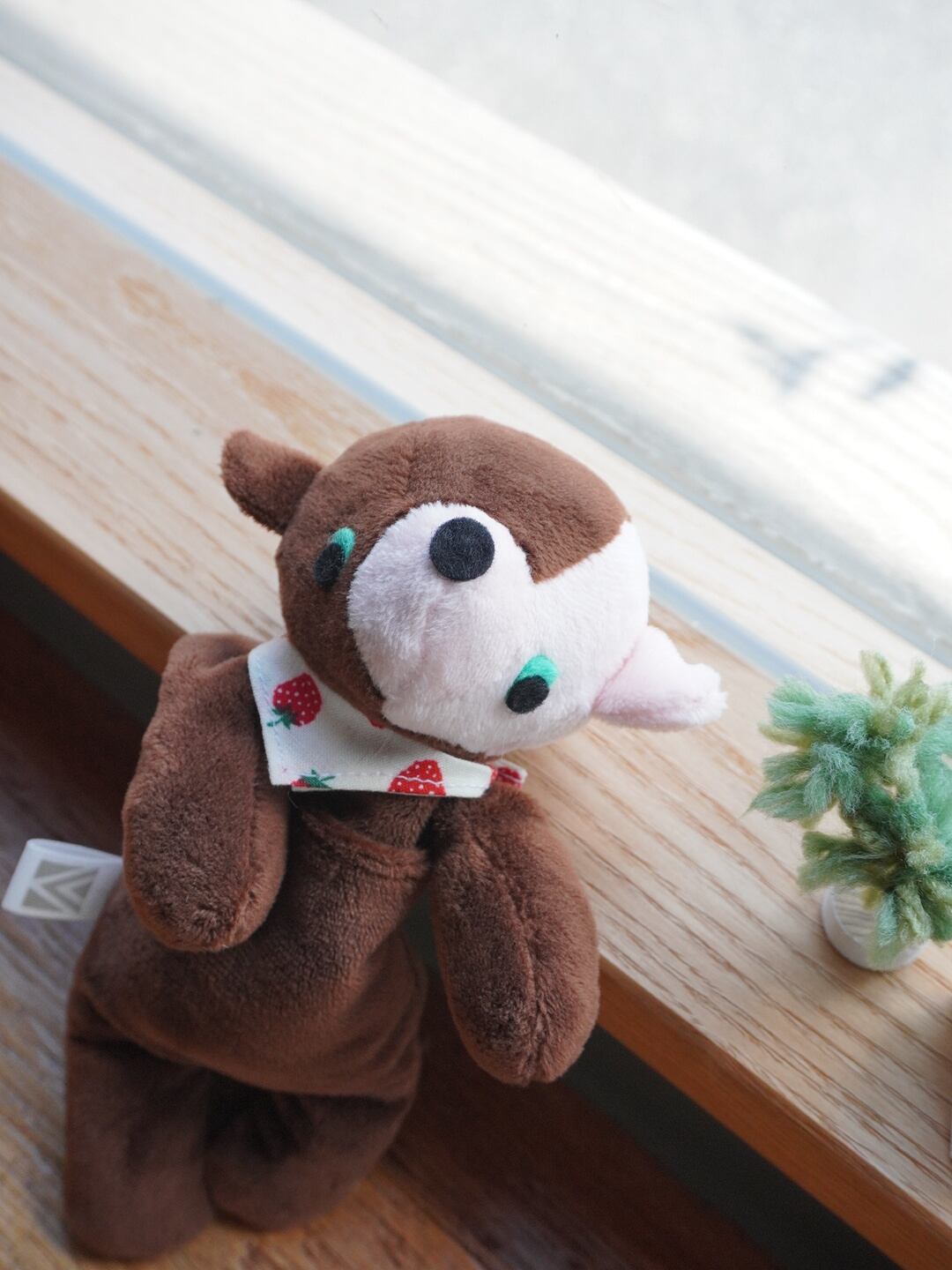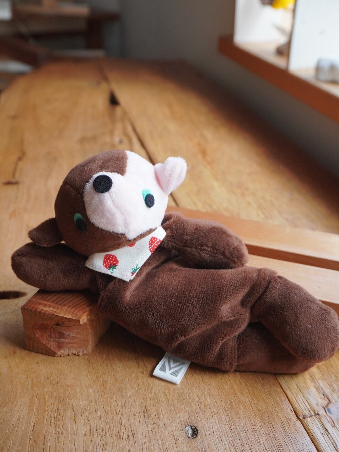 そのかわゆさの秘密をほんの少しだけお伝えするならば、左耳としっぽ裏にさりげな-くいちご柄の生地が使われていたりですね、あれ、バンダナが、いちご柄だ!ね、かわいいよね~これね~