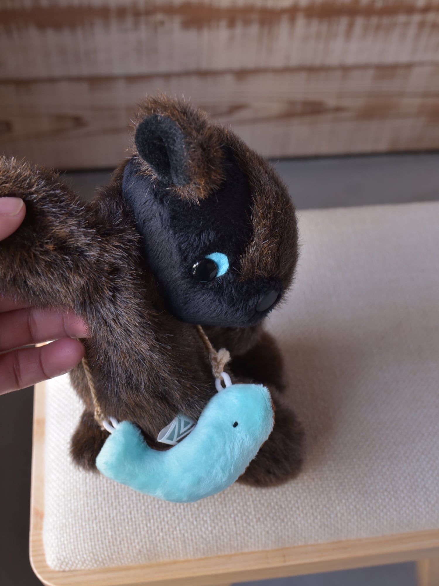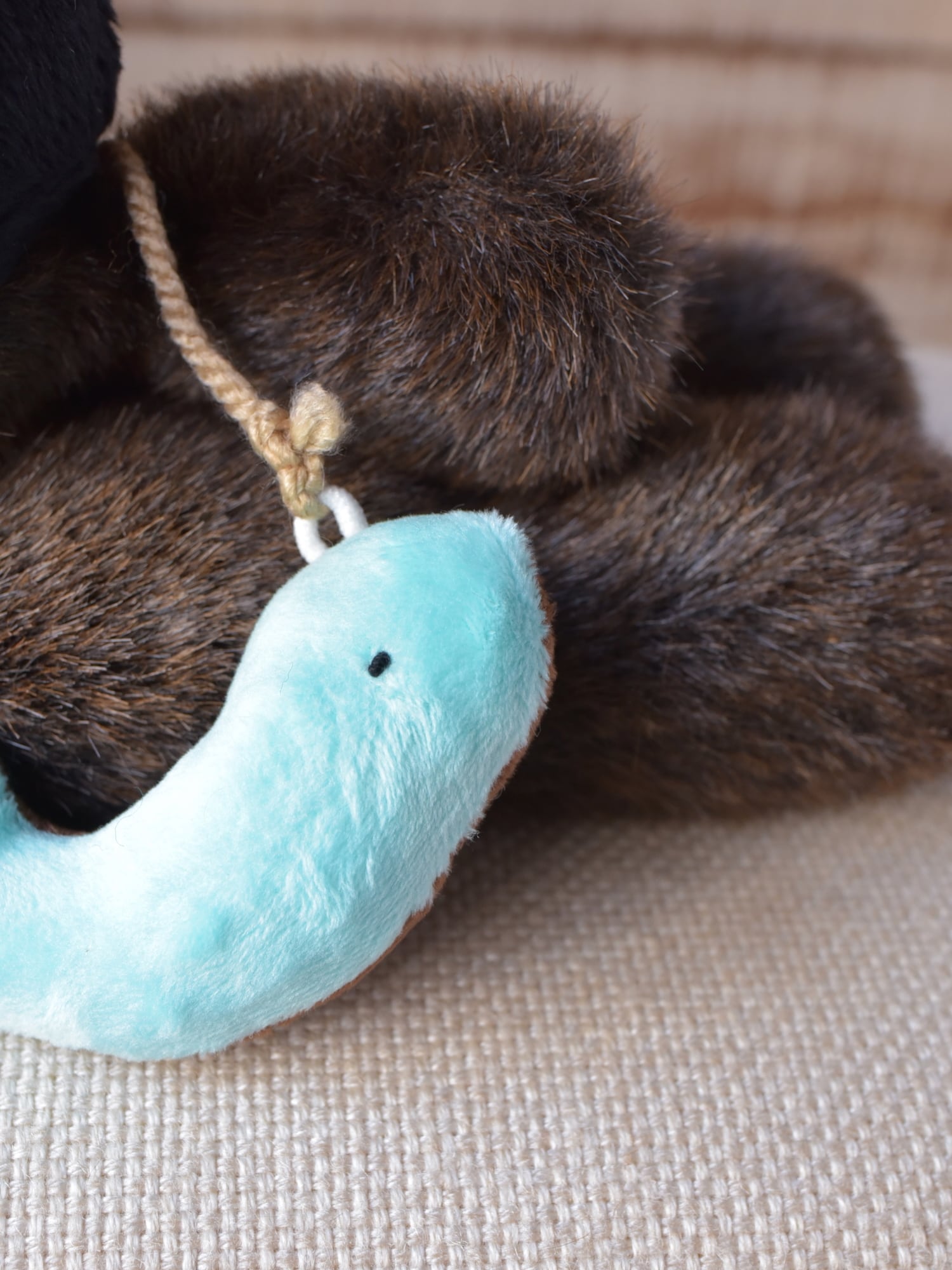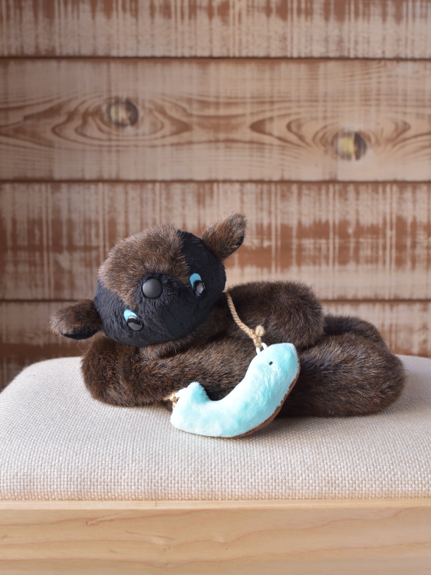お顔は廃盤となりましたしっとりファーのブラックをまとい、ほんのり優しげ、また、ファーの力強さを活かすためにノーポケットでございます。その変わりさかな氏、今回はチョコとミントのリバーシブルタイプがセットになります。ボディのお色ととてもよく合ってますね-