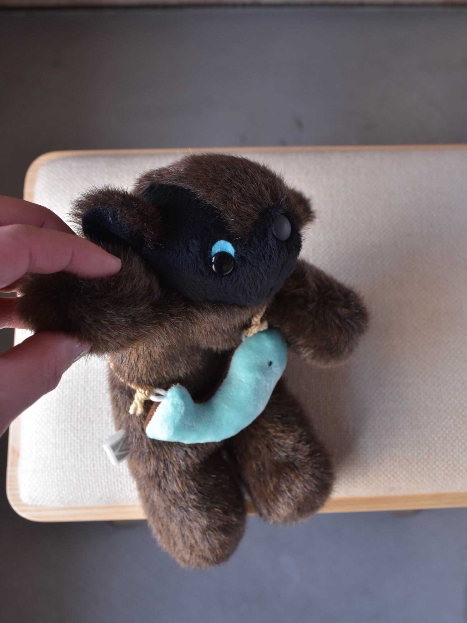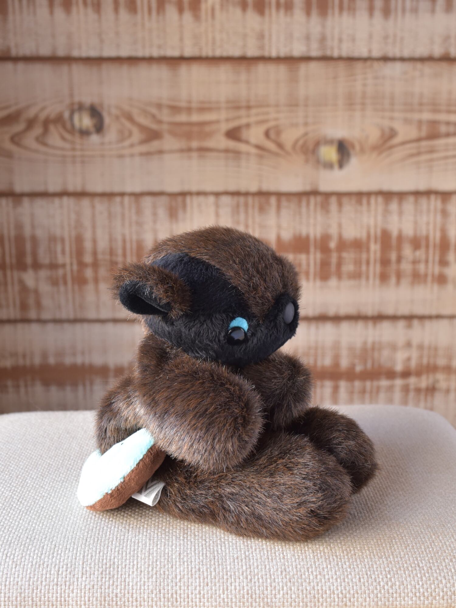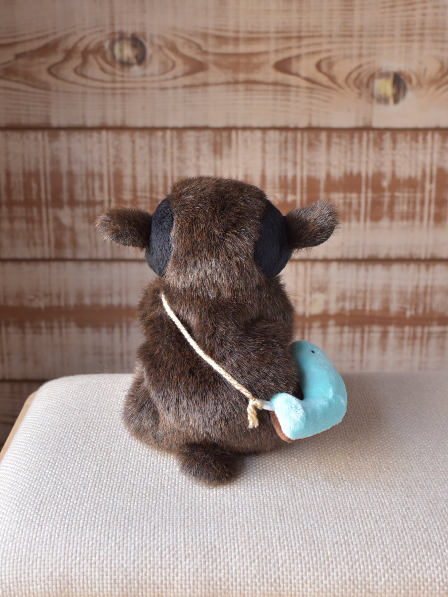 お顔は廃盤となりましたしっとりファーのブラックをまとい、ほんのり優しげ、また、ファーの力強さを活かすためにノーポケットでございます。その変わりさかな氏、今回はチョコとミントのリバーシブルタイプがセットになります。ボディのお色ととてもよく合ってますね-