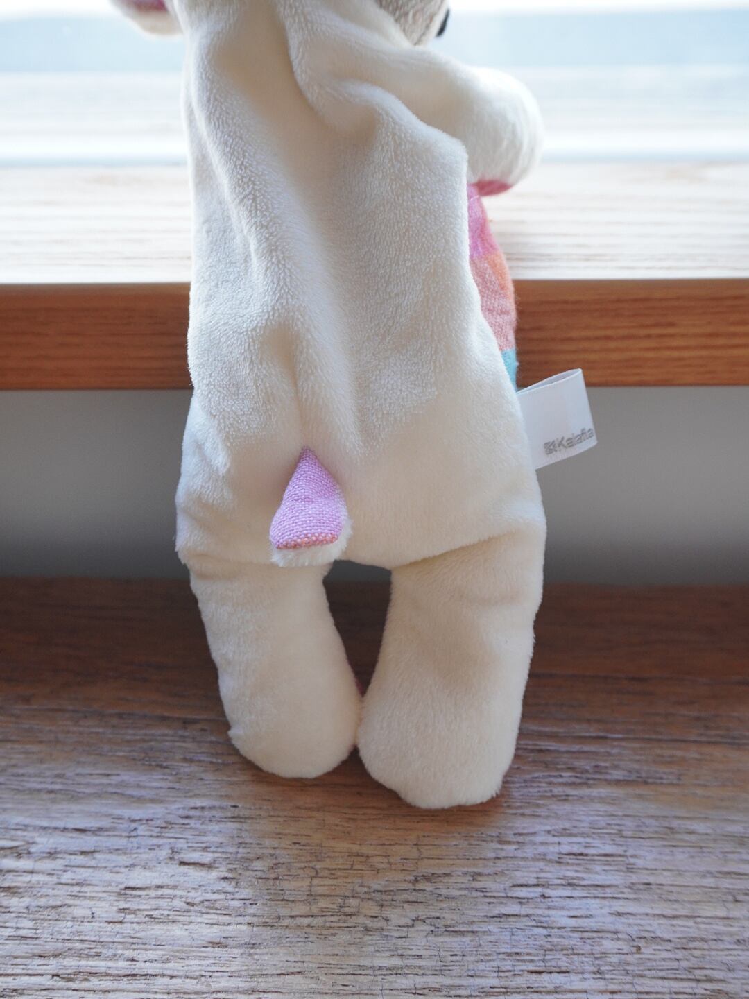 背中はミルク色のなめらか生地、お顔はベージュのネップツイード生地、そしてボディ前面は先染めのチェック柄オックス生地となっております。先染めなので、明るい色調ですが深みがあるような風合いでして、こりゃいい生地選んだなと。そんなふうに感じておる次第です。