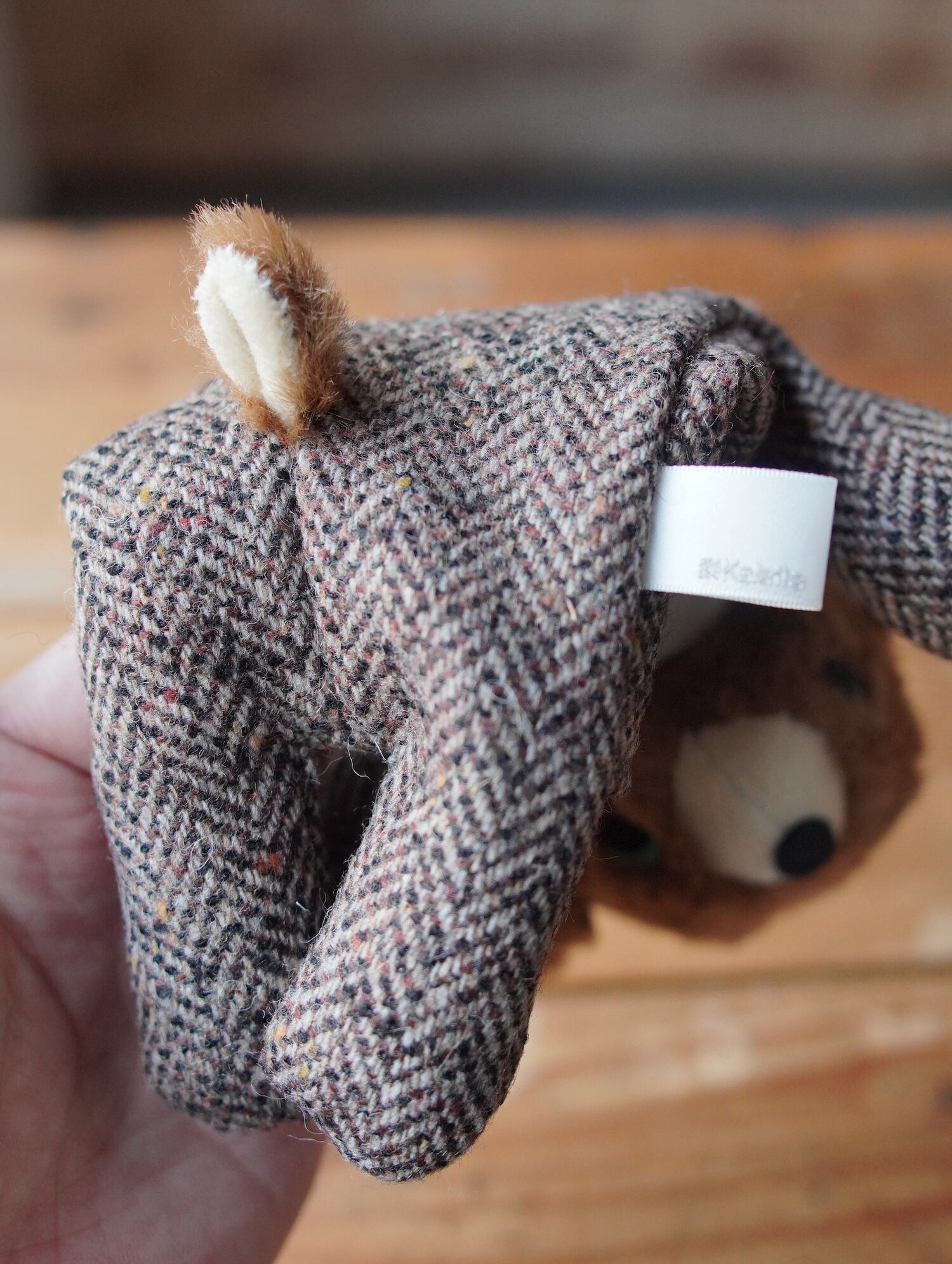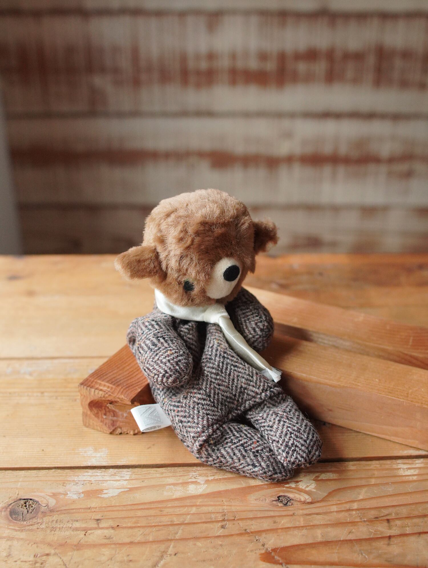 クラシカルなヘリンボーン柄のウールツィード生地(ウール70%)と熊さんヘッド、そしてサテンマフラーでクールにキメたお洒落さんです!